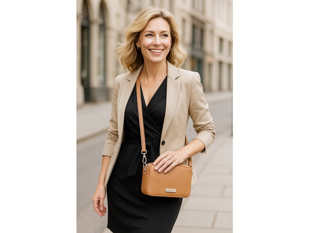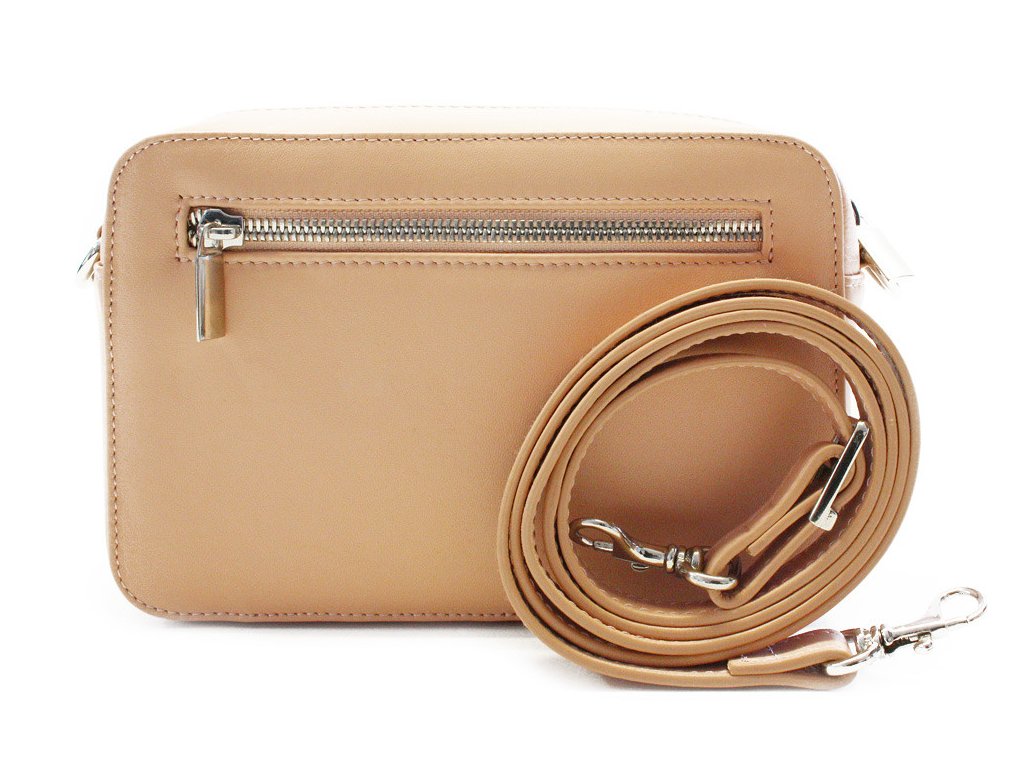 Crossbody dámska kožená kabelka chránená zipsom má tvar obdĺžnika. Obsahuje jedno vrecko, vo vnútri sa nachádza malé otvorené vrecko na drobnosti. Na zadnej vonkajšej strane je zipsové vrecko. Súčasťou kabelky je odnímateľný nastaviteľný popruh.