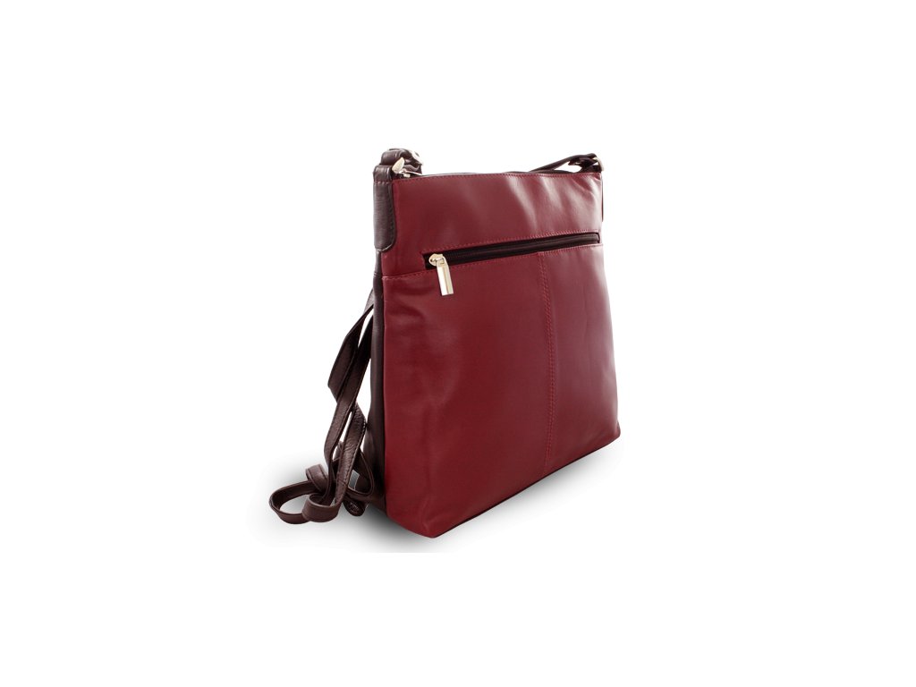 Obojstranná kabelka - predná strana burgundy, zadná strana čierna farba. 1 hlavné zipsové vrecko, 1 vnútorné zipsové a 1 otvorené vrecko, 2 vonkajšie zipsové vrecká, zrkadlo v koženom púzdre, nastaviteľný kožený popruh v max. dĺžke 145 cm.