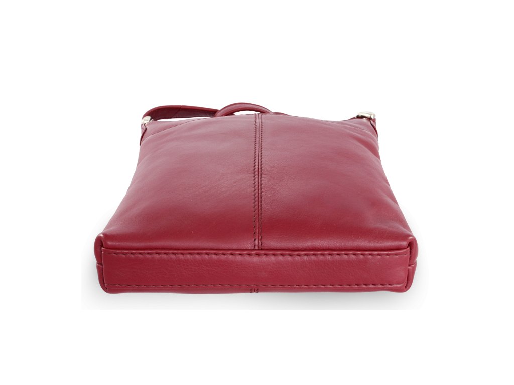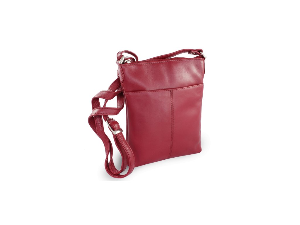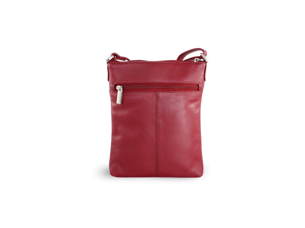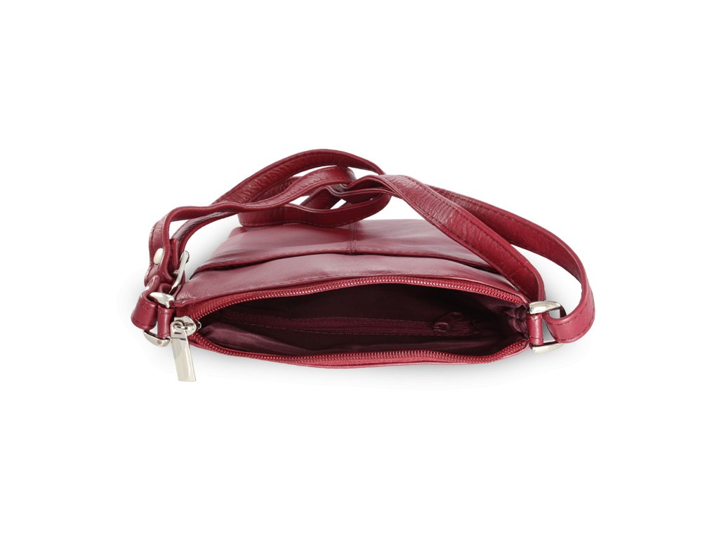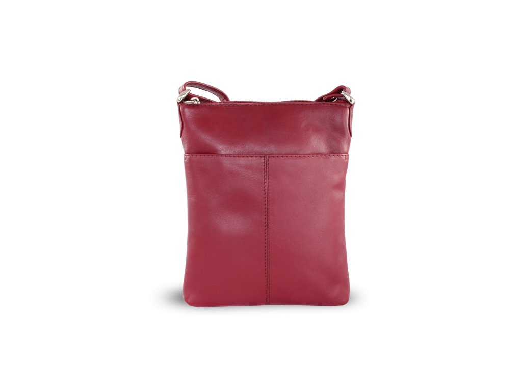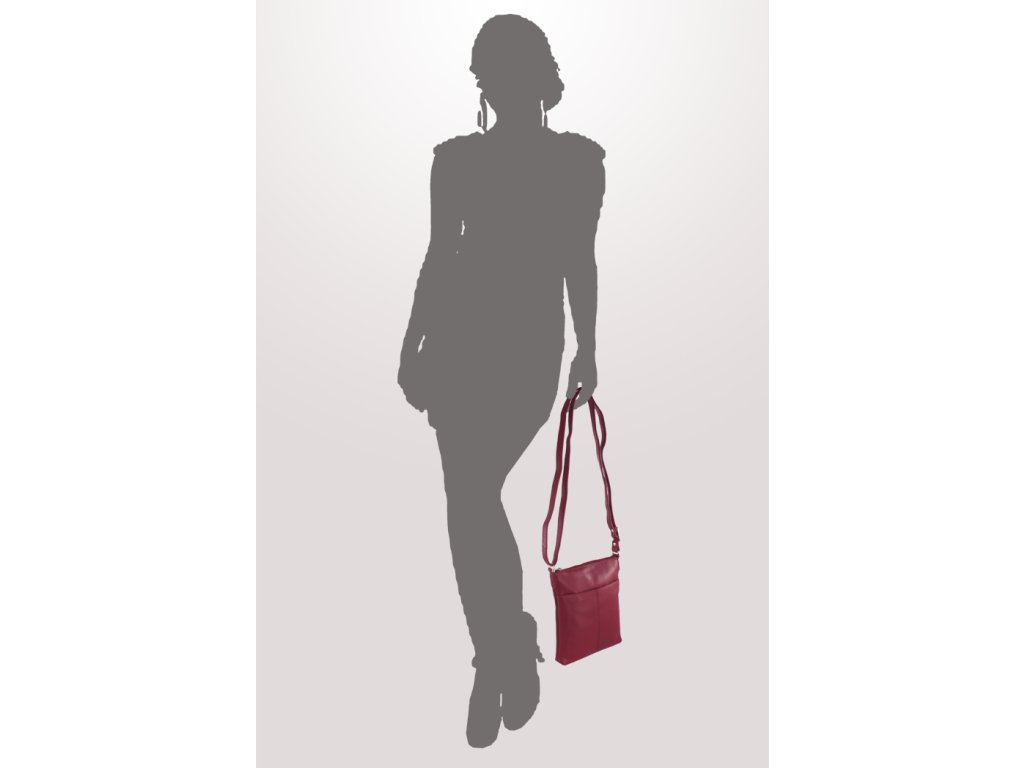 Vnútorné zipsové vrecko, odopínateľný krúžok na kľúče, zrkadlo v koženom púzdre, vonkajšie zipsové a otvorené vrecko, nastaviteľný kožený popruh v max. dĺžke 140 cm.