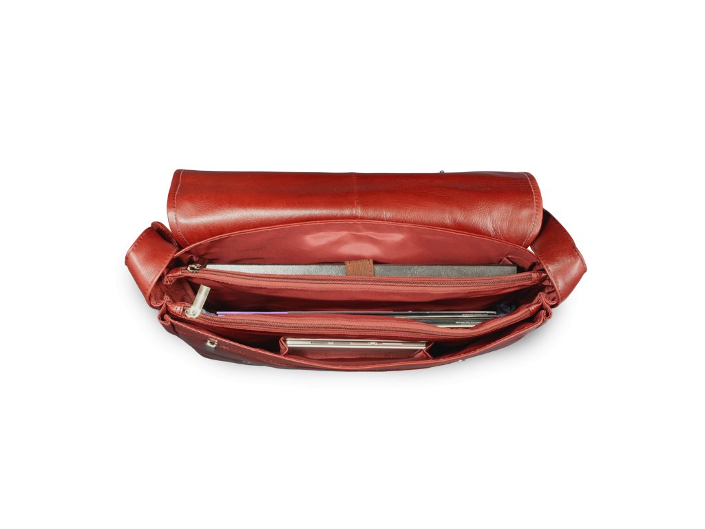 4 vnútorné separácie, z toho jedna polstrovaná časť pre uloženie notebooku (netbooku, minibooku alebo tabletu) až do veľkosti 13,3" (33,8 cm). Maximálne rozmery notebooku 32 x 22 x 3,5 cm. 2 vnútorné zipsové vrecká, vnútorné vrecko na mobil, 1 predné zipsové vrecko pod hlavnou poklopom a 1 vonkajšie zipsové vrecko na zadnej strane.Nastaviteľný popruh cez rameno v max. dĺžke 120 cm.Hlavná poklop je zaistená dvoma magnetickými zámkami.Červené prešívanie.