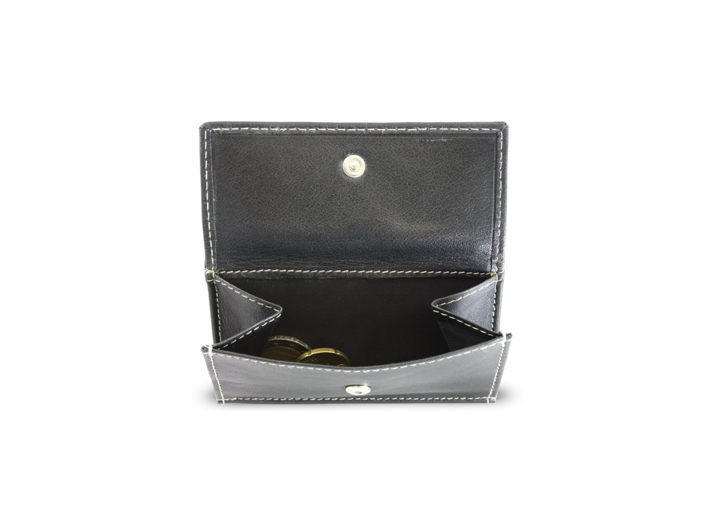 Vonkajšie poklopové vrecko na mince, 2 priehradky na bankovky, 1 vrecko na kreditné karty. Svetlosivé prešívanie.