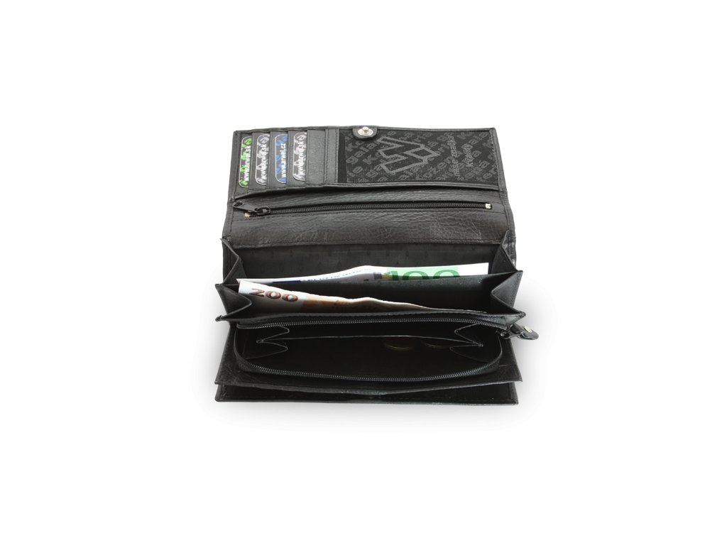 2 priehradky na bankovky + 1 zdvojené zipsové vrecko na mince, 8 vreciek na kreditné karty, 3 priehľadné vrecká, 1 vnútorné a 1 zipsové vrecko, 1 zipsové a 1 otvorené zadné vrecko.