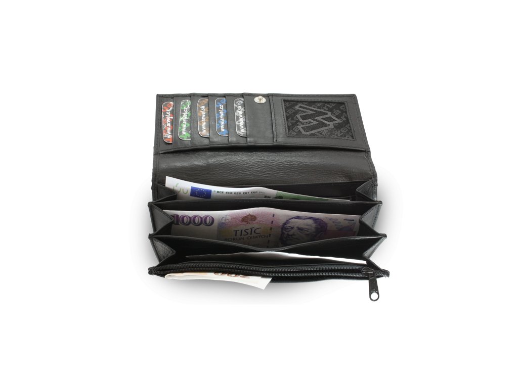 3 priehradky na bankovky + 1 zipsové vrecko na mince, 6 vreciek na kreditné karty, 3 vnútorné vrecká, 1 zipsové a 1 otvorené zadné vrecko.