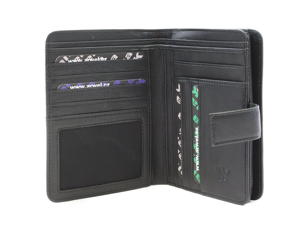2 priehradky na bankovky, 12 vreciek na kreditné karty, zipsové zdvojené vrecko na mince s vnútorným zipsovým vreckom a 1 priehľadné vrecko vo veľkosti osobných dokladov.