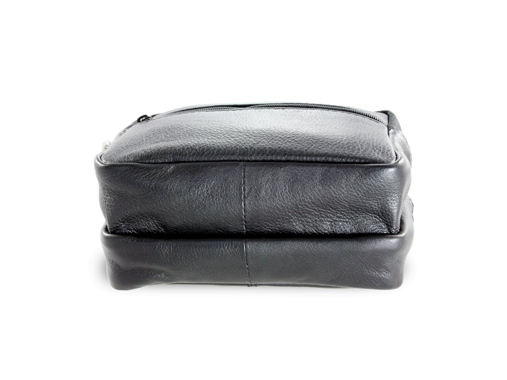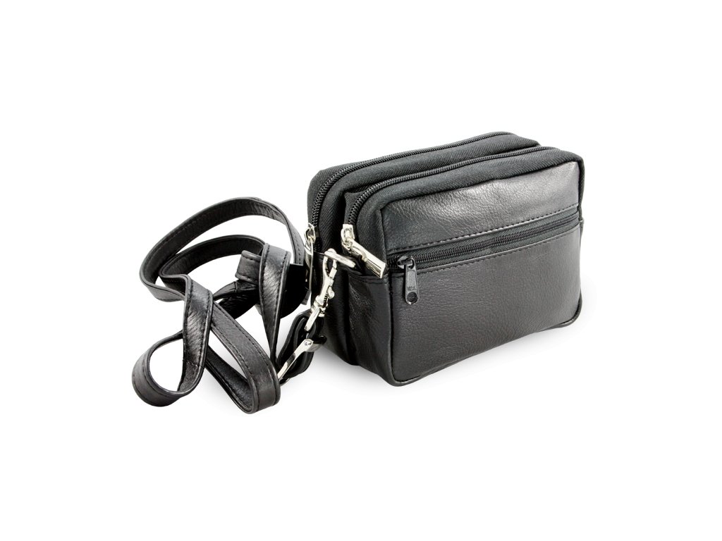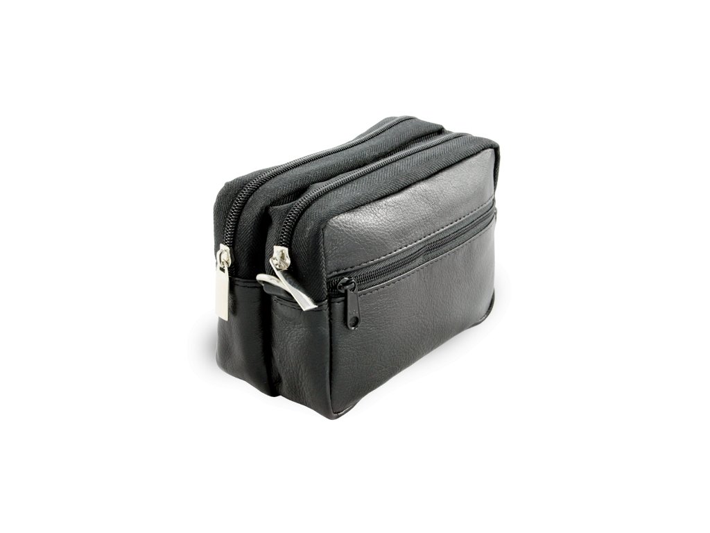 Menšia kožená etue na doklady na cestovanie a turistiku. 2 veľké zipsové vrecká a malé predné vrecko, na zadnej strane pútko pre opasok, súčasťou je odopínací a nastaviteľný kožený popruh v max dĺžke 140 cm s karabínkami.