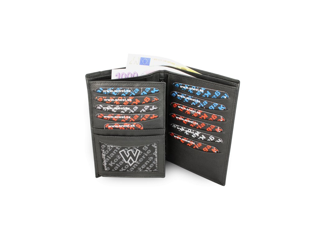 Puzdro na doklady s priehradkou na bankovky, 10 vreciek na kreditné karty, 3 priehľadné, 4 vnútorné a 1 zipsové vrecko. Vhodná pre cestovný pas.