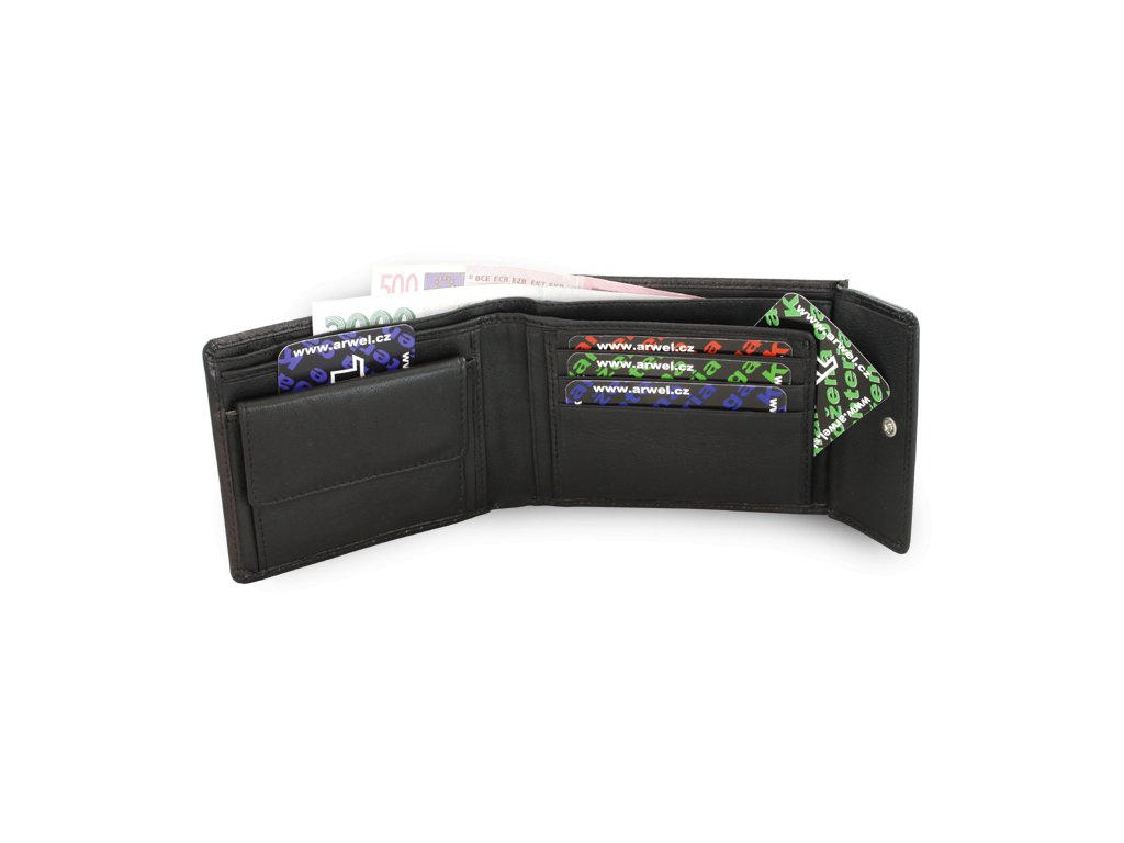 2 priehradky na bankovky, klopnové vrecko na mince, 8 vreciek na kreditné karty, občiansky alebo vodičský preukaz. Dodávame v štýlovej darčekovej krabičke.