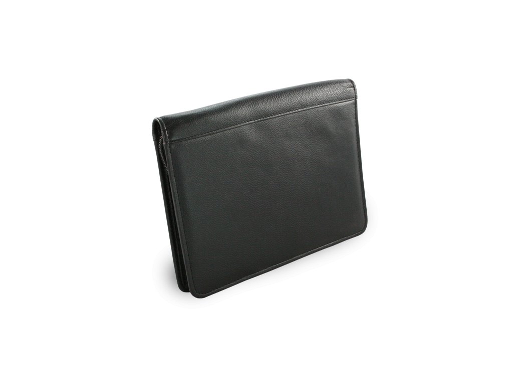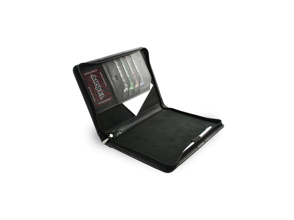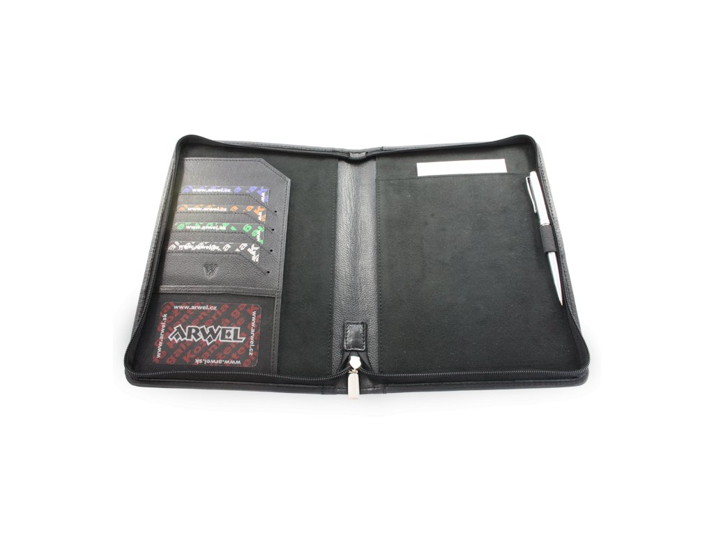 Spisové zipsové dosky na prichytenie poznámkového bloku A5, 4 priehradky na kreditné karty, 1 menšie vrecko a úchyt na písacie potreby. Vnútorný semišový podklad.