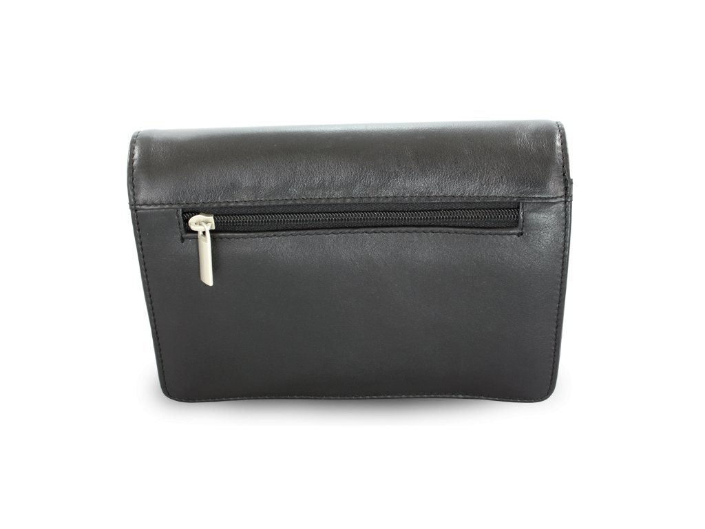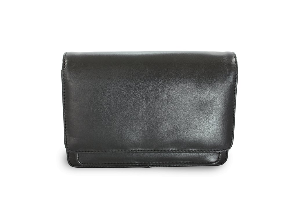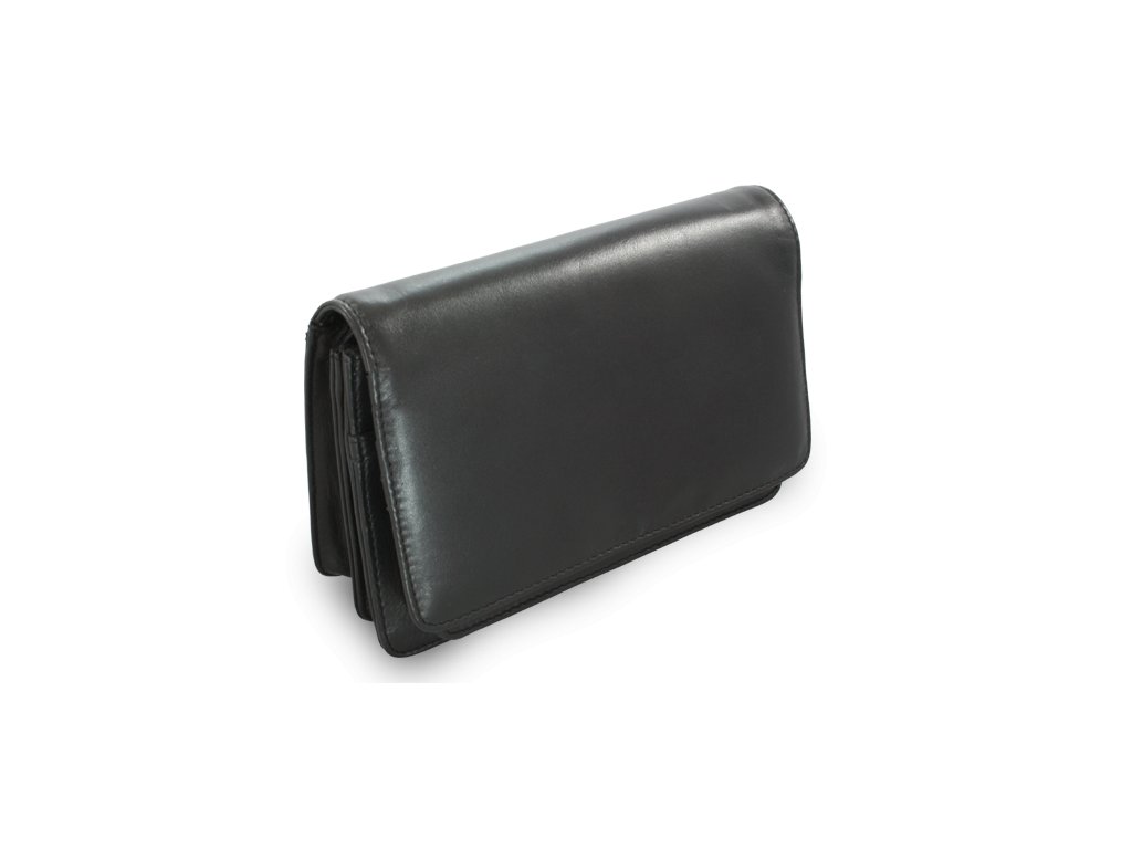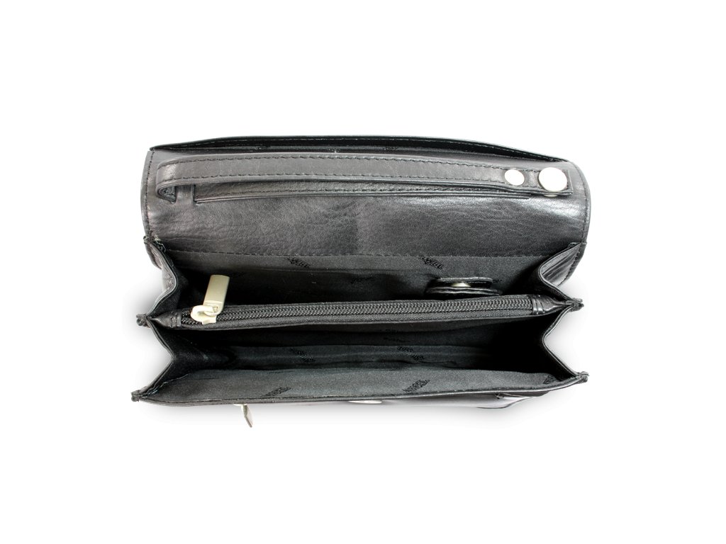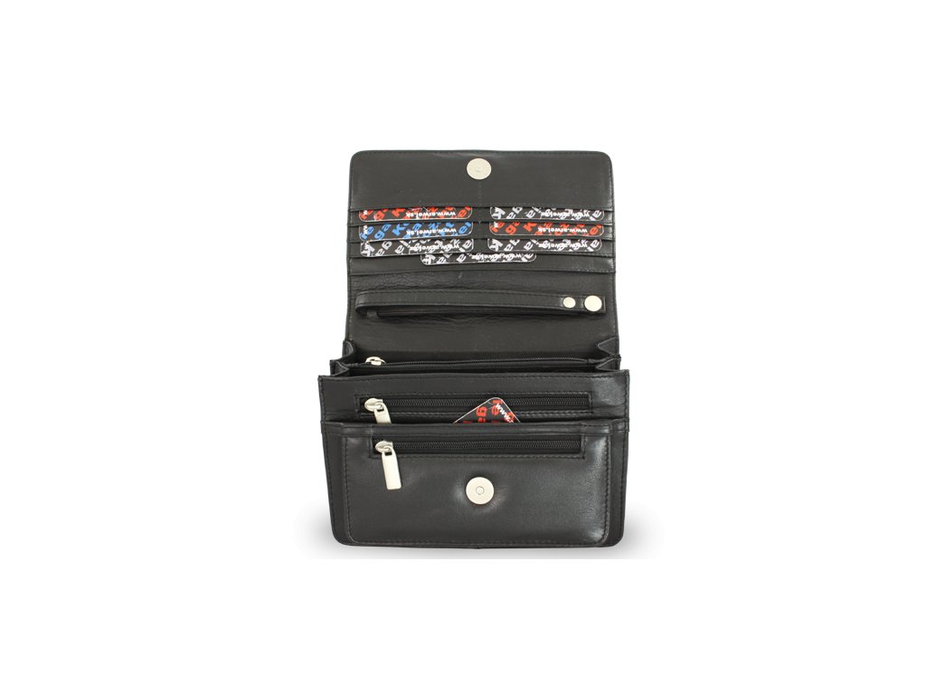 2 separácie oddelené zipsovým vreckom, 6 vreciek pre kreditné karty, 2 zipsové a 3 vnútorné vrecká, odopínateľný krúžok na kľúče, vonkajšie zipsové vrecko, pútko na zápästie.