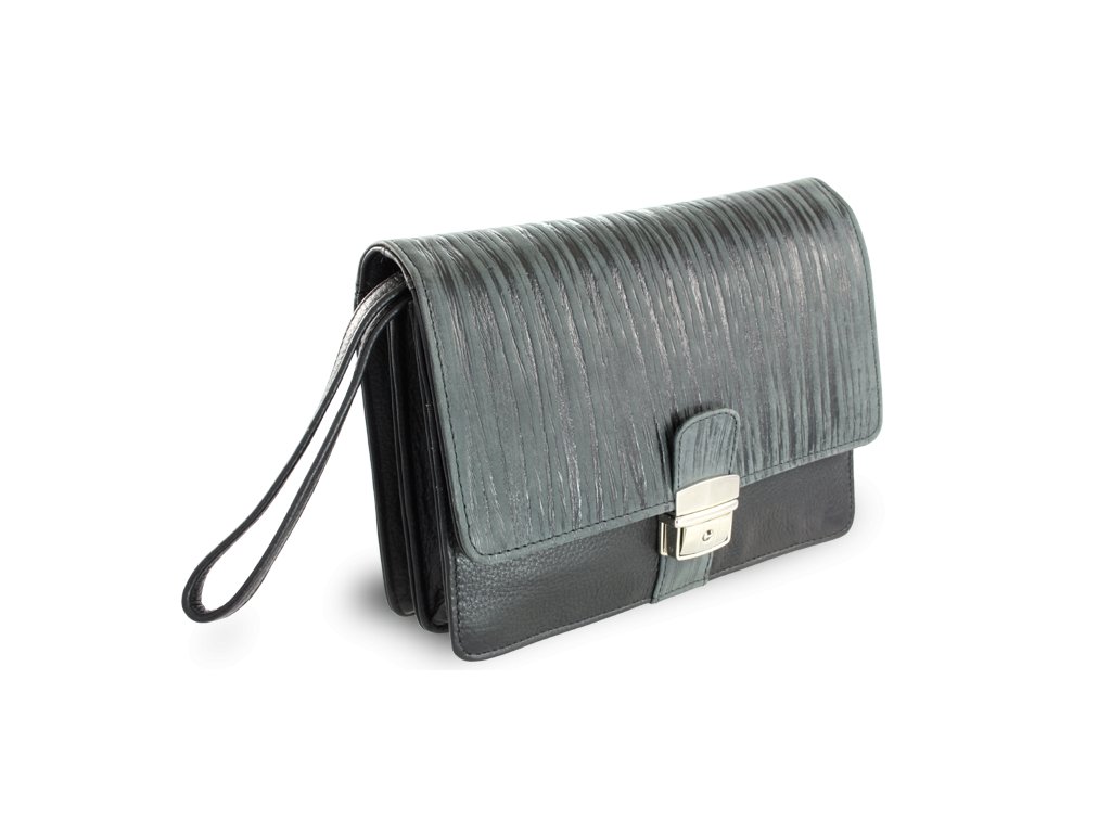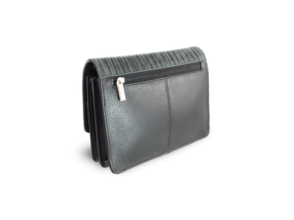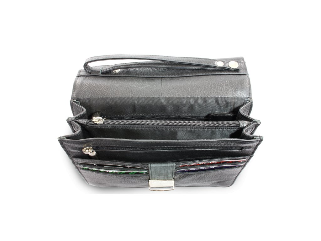2 separácie oddelené zipsovým vreckom, 4 vrecká pre kreditné karty, 2 zipsové a 1 vnútorné vrecko, odopínateľný krúžok na kľúče, vonkajšie zipsové vrecko, pútko na zápästie.