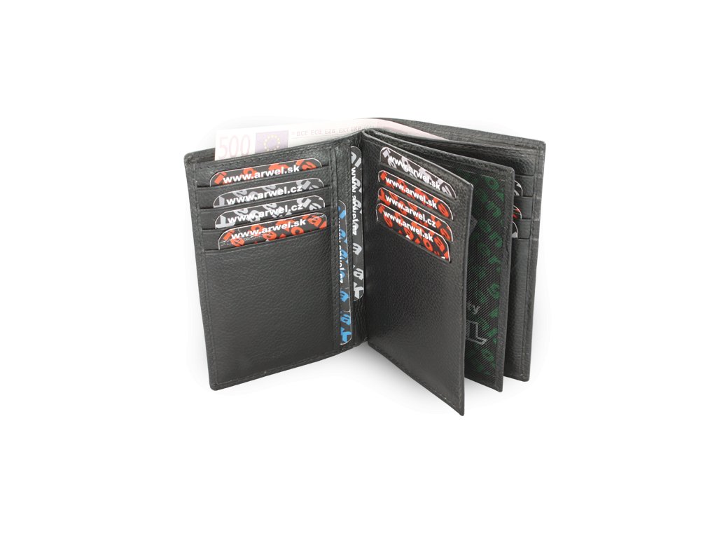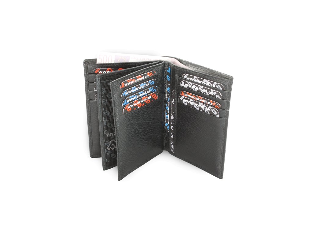 Puzdro na doklady s priehradkou na bankovky, 16 vreciek na kreditné karty, 2 priehľadné a 4 bočné vrecká.