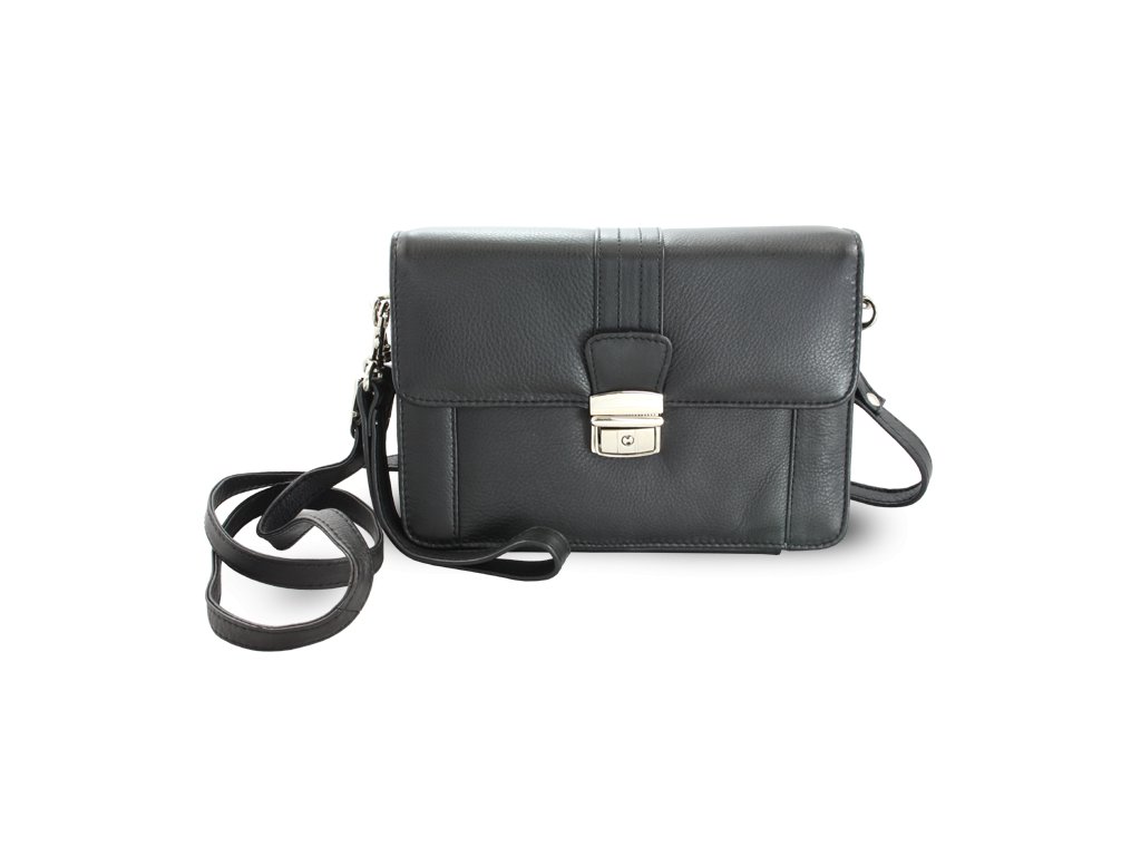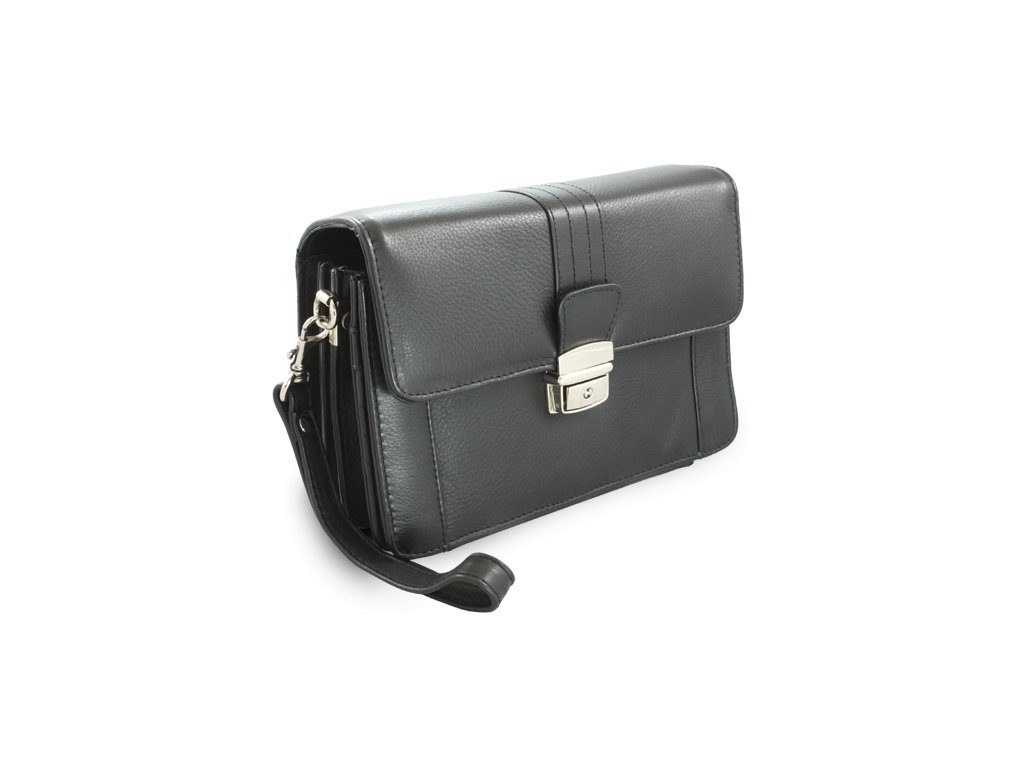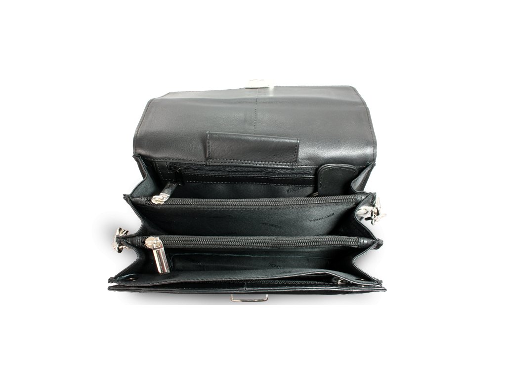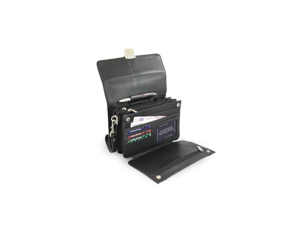 3 separácie oddelené zipsovými vreckami, sklápací register s 2 separáciami na doklady, 4 vrecká pre platobné karty či vizitky, 2 zipsové vrecká, odopínateľný krúžok na kľúče, odopínacie pútko na zápästie, odopínací popruh cez rameno.