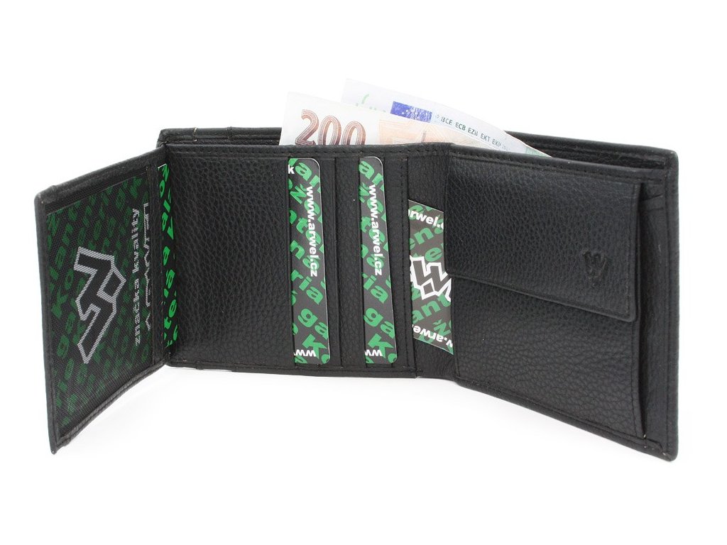 2 priehradky na bankovky, klopnové vrecko na mince, 10 vreciek na kreditné karty, občiansky alebo vodičský preukaz, 2 skryté vrecká, 1 priehľadné okno.