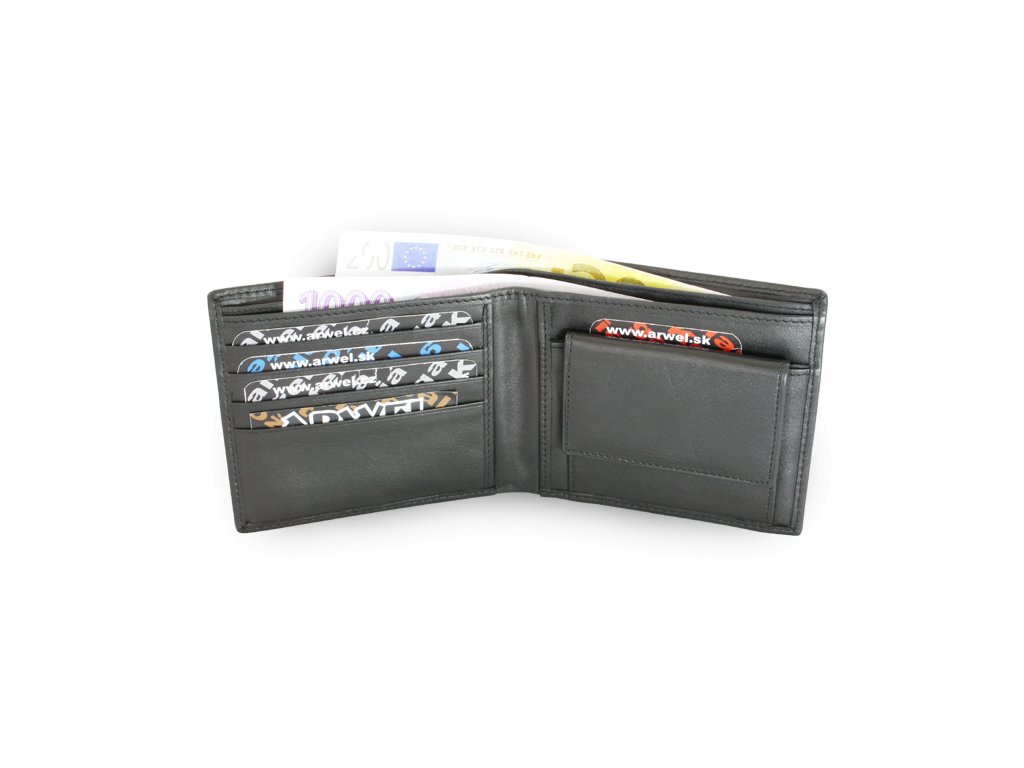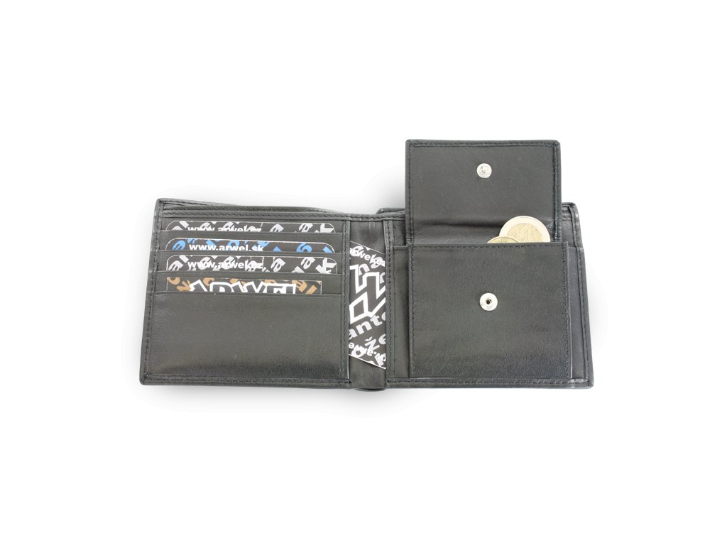 2 priehradky na bankovky, 1 vrecko na mince, 4 vrecká na kreditné karty, 1 menšie a 2 veľké vrecká na doklady.