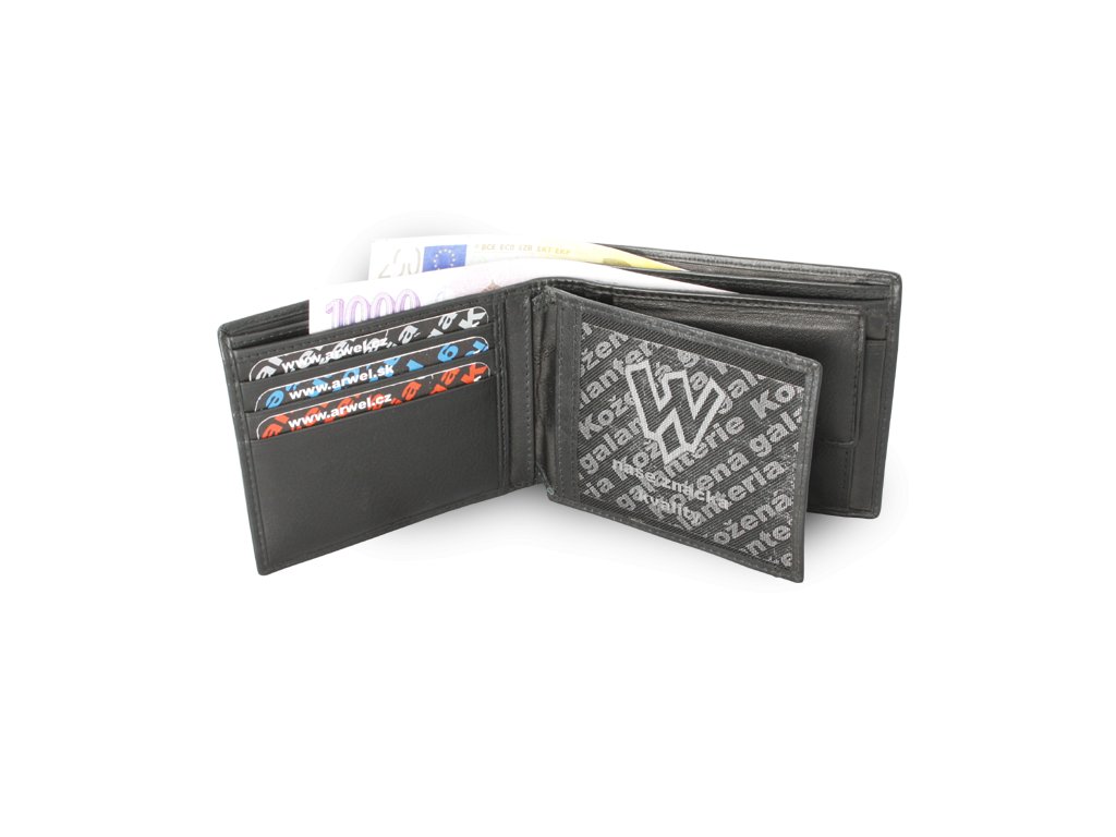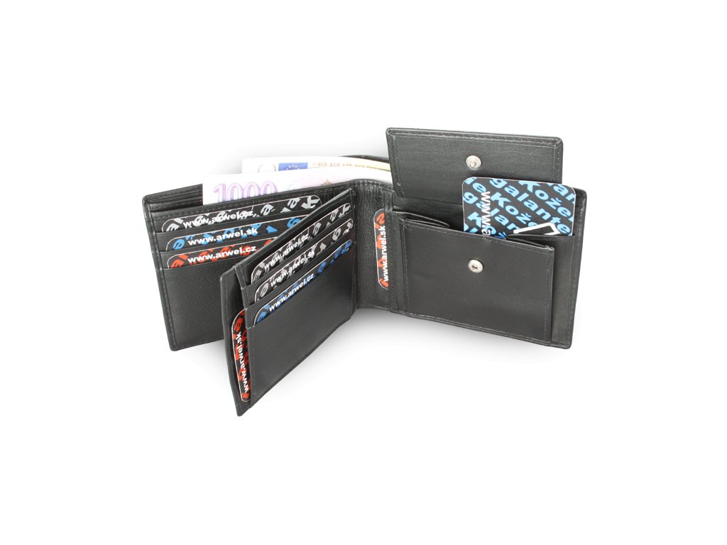 2 priehradky na bankovky, vrecko na mince, 6 vreciek na kreditné karty, 1 priehľadná a 4 vnútorné vrecká veľkosti osobných dokladov.