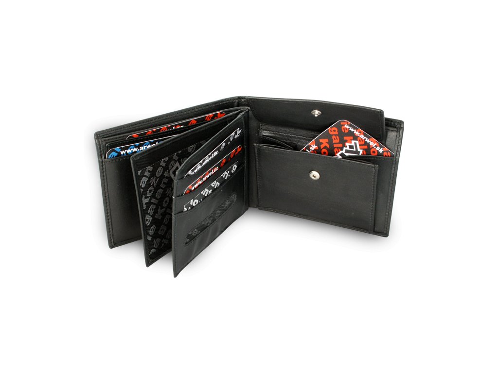2 priehradky na bankovky, 1 vrecko na mince, 5 vreciek na kreditné karty, 3 priehľadné, 2 bočné a jedno vnútorné vrecko, vrecká veľkosti osobných dokladov.