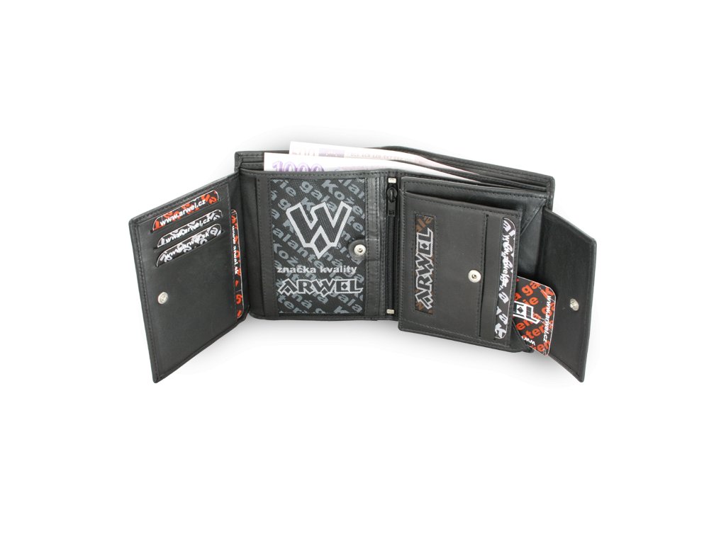 Rozkladacia, 2 priehradky na bankovky, vrecko na mince, 12 vreciek na kreditné karty, 2 vnútorné a 2 priehľadné vrecká veľkosti osobných dokladov a 1 zipsové vrecko.
