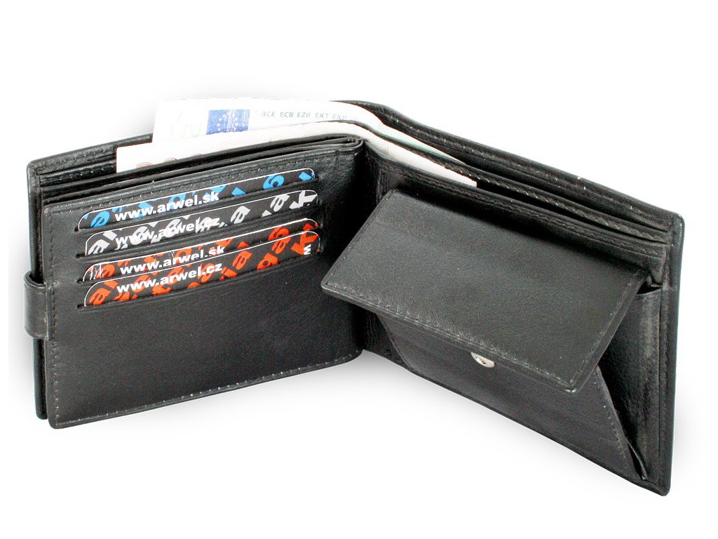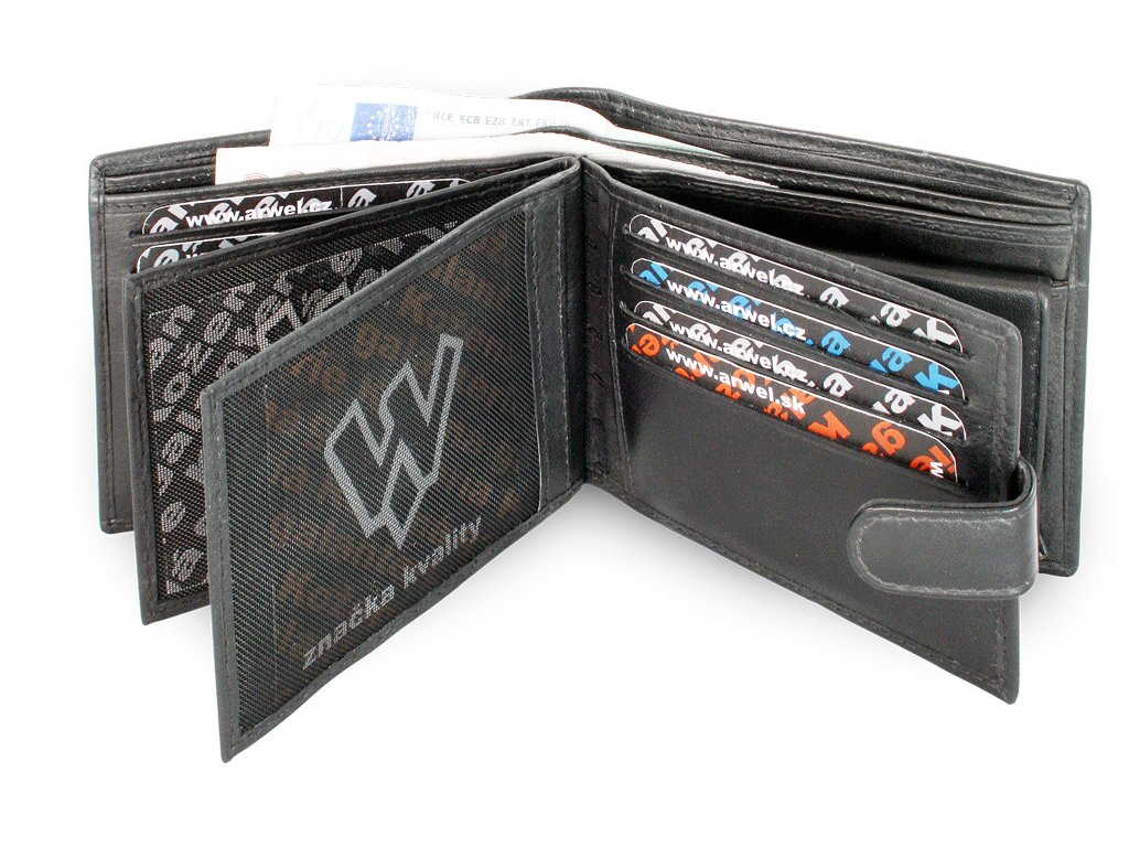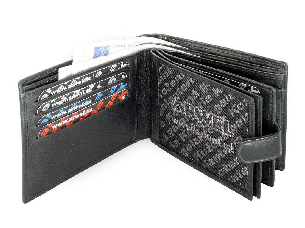 Pánska peňaženka so zápinkou obsahuje 2 priehradky na bankovky, vrecko na mince, 12 vreciek na kreditné karty, 3 vnútorné a 2 priehľadné vrecká.