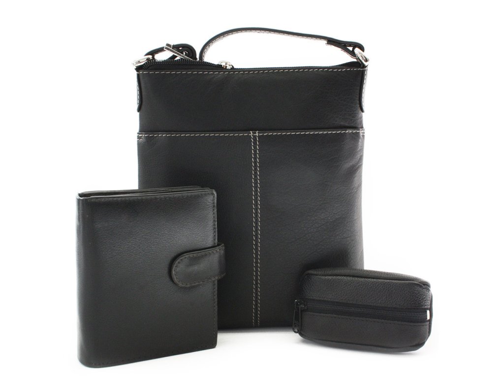 Luxusná sada v čiernej farbe z pravej kože predstavuje elegantné a praktické riešenie pre ženy, ktoré oceňujú štýl aj funkčnosť. Set obsahuje dámsku kabelku, peňaženku a kľúčenku - dokonale zladené doplnky v modernom čiernom odtieni.