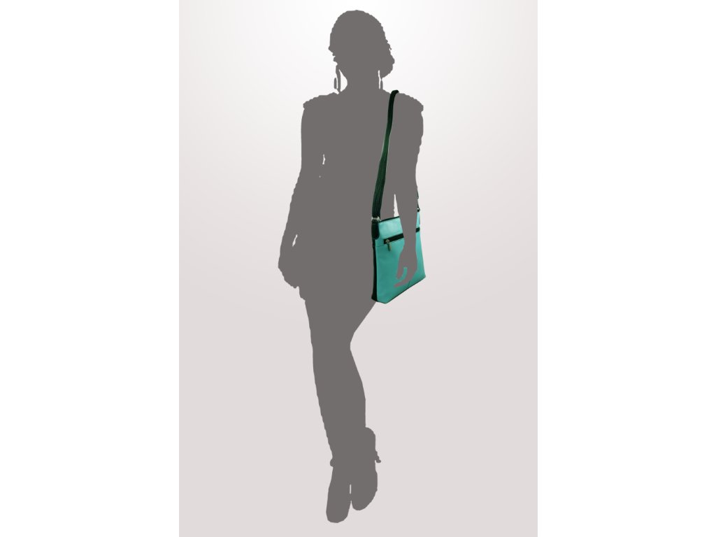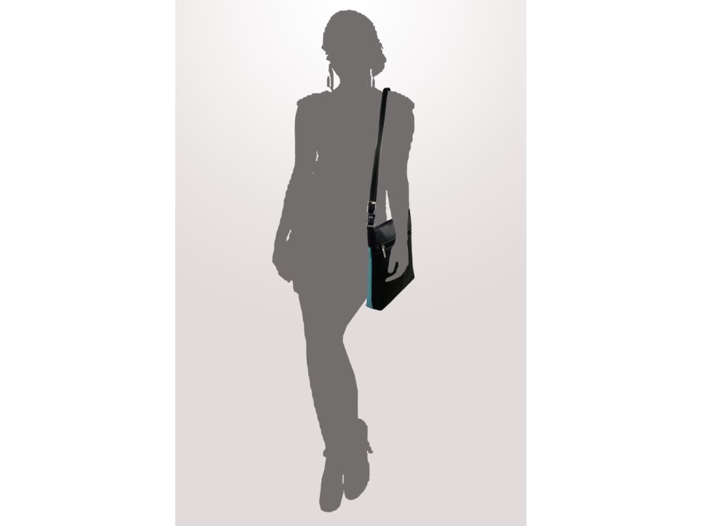 Obojstranná kabelka - predná strana bledo modrá, zadná strana čierna. 1 hlavné zipsové vrecko, 1 vnútorné zipsové a 1 otvorené vrecko, 2 vonkajšie zipsové vrecká, zrkadlo v koženom púzdre, nastaviteľný kožený popruh v max. dĺžke 145 cm.
