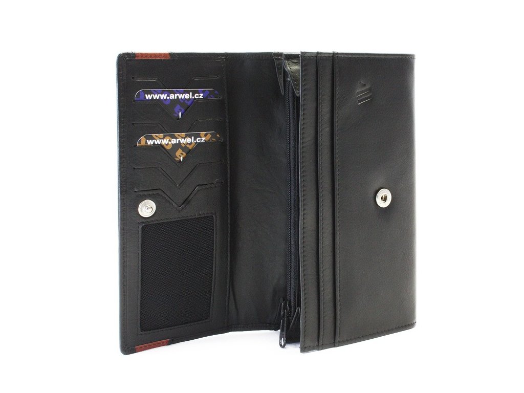 Kožená dámska klopnová peňaženka obsahuje 2 priehradky na bankovky, zipsové vrecko na mince, 5 vreciek na kreditné karty, 1 priehľadné vrecko a 2 otvorené vrecká. Na zadnej vonkajšej strane sa nachádza 1 otvorené a 1 zipsové vrecko.