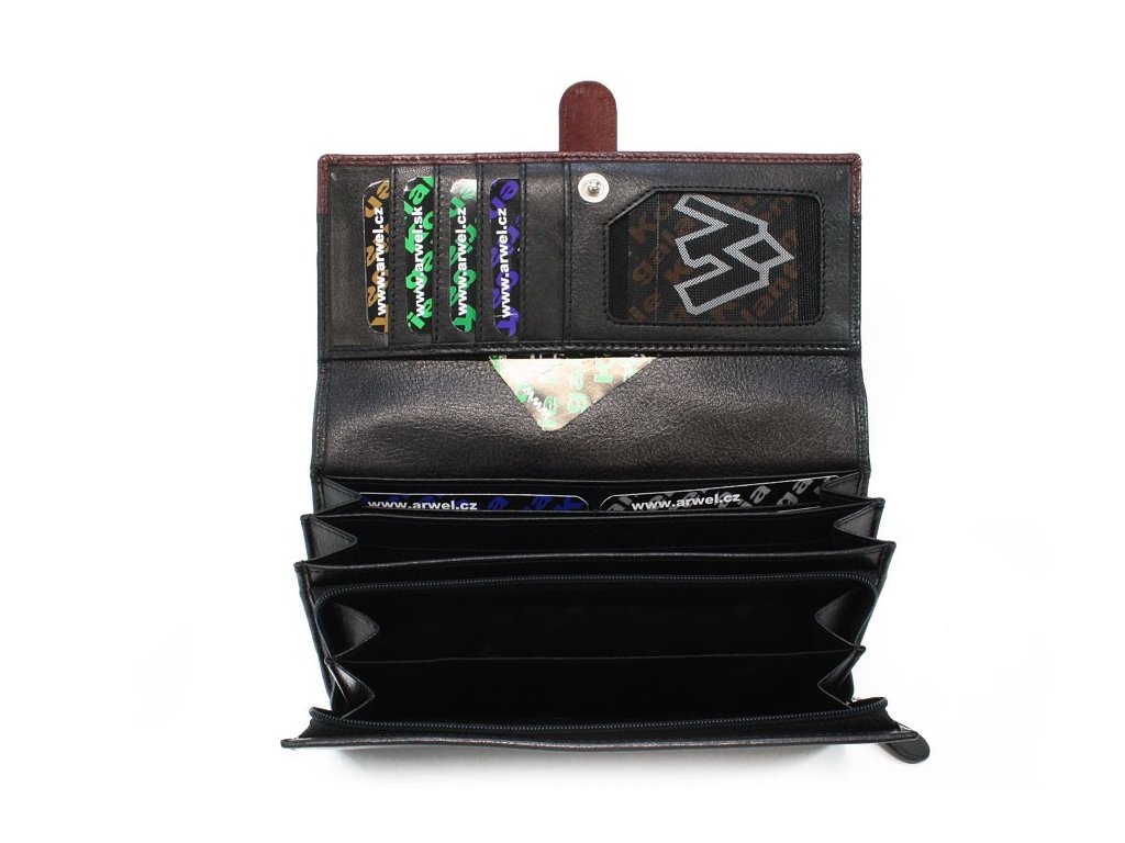 2 priehradky na bankovky + 1 zipsové vrecko na mince, 10 vreciek na kreditné karty, 1 priehľadné vrecko, 2 vnútorné vrecká, 1 otvorené zadné vrecko.