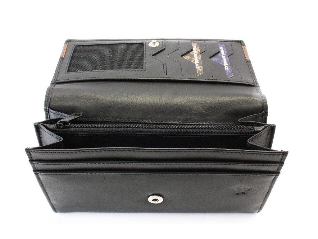 Kožená dámska klopnová peňaženka obsahuje 2 priehradky na bankovky, zipsové vrecko na mince, 5 vreciek na kreditné karty, 1 priehľadné vrecko a 2 otvorené vrecká. Na zadnej vonkajšej strane sa nachádza 1 otvorené a 1 zipsové vrecko.