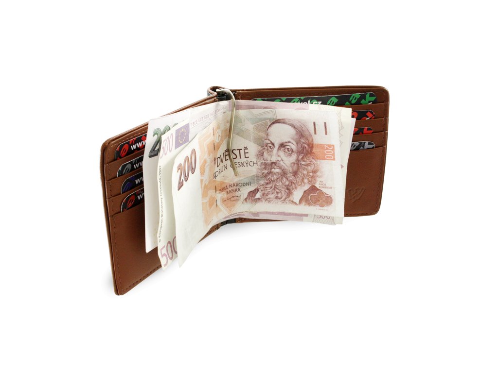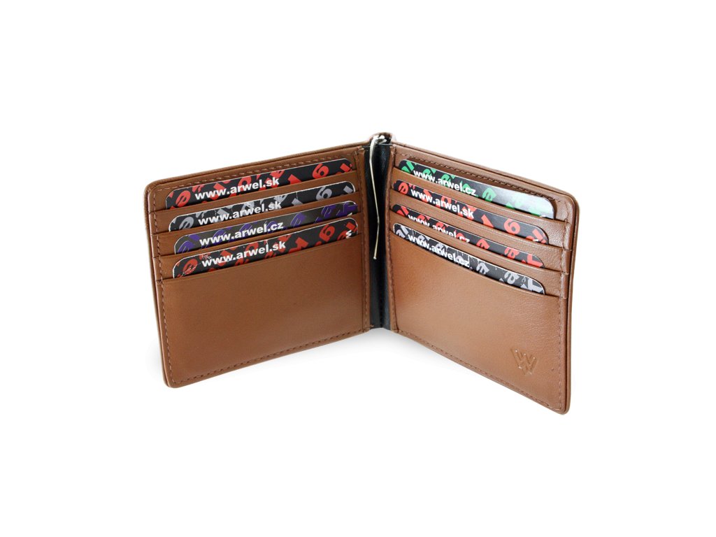 Pružina na uchytenie bankoviek, 8 vreciek na kreditné karty, 2 vnútorné vrecká a vonkajšie vrecko na mince. Šitie v hnedej farbe.