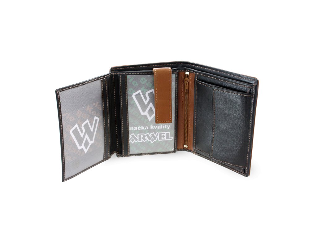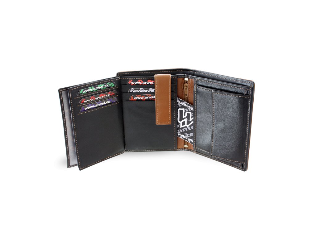 2 priehradky na bankovky, klopnové vrecko na mince, 9 vreciek na kreditné karty, občiansky preukaz alebo vodičský preukaz, vnútorné zipsové vrecko, 2 veľké priehľadné vrecká, 2 skryté vrecká. Hnedé šitie.