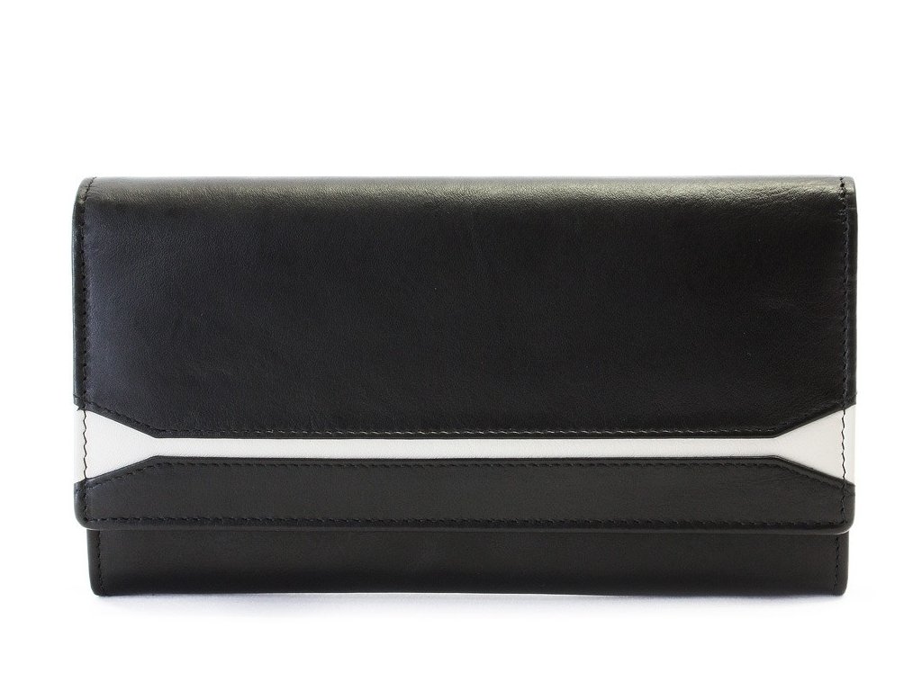 Kožená dámska klopnová peňaženka obsahuje 2 priehradky na bankovky, zipsové vrecko na mince, 5 vreciek na kreditné karty, 1 priehľadné vrecko a 2 otvorené vrecká. Na zadnej vonkajšej strane sa nachádza 1 otvorené a 1 zipsové vrecko.