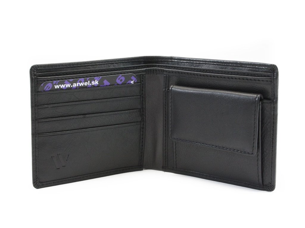 2 priehradky na bankovky, 1 vrecko na mince, 4 vrecká na kreditné karty, 1 menšie a 2 veľké vrecká na doklady.