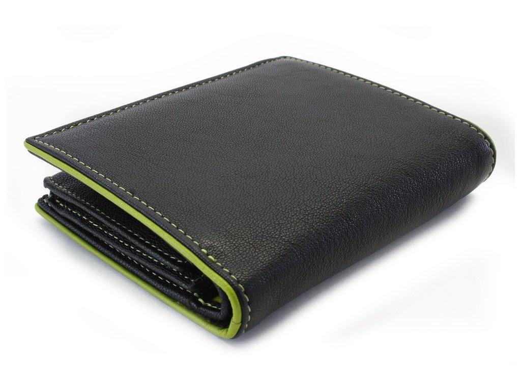 2 priehradky na bankovky, klopnové vrecko na mince, 9 vreciek na kreditné karty, občiansky preukaz alebo vodičský preukaz, vnútorné zipsové vrecko, 2 veľké priehľadné vrecká, 2 skryté vrecká. Zelené šitie.
