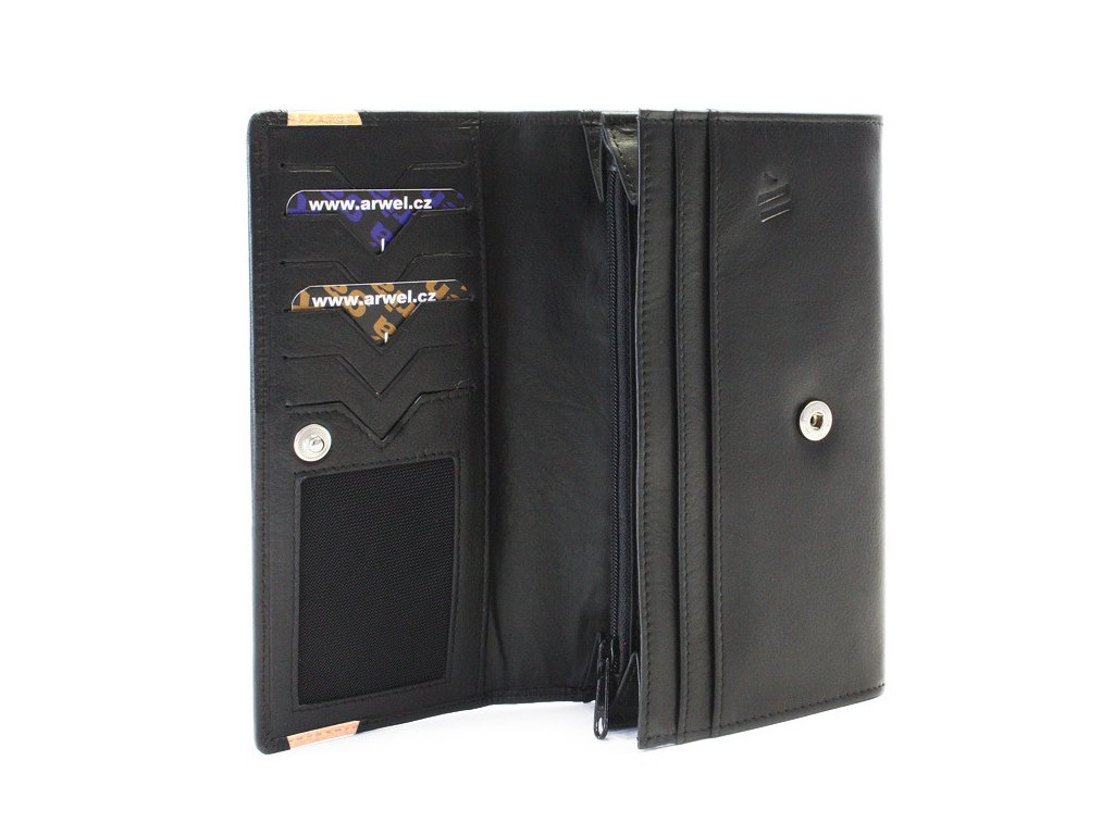 Kožená dámska klopová peňaženka obsahuje 2 priehradky na bankovky, zipsové vrecko na mince, 5 vreciek na kreditné karty, 1 priehľadné vrecko a 2 otvorené vrecká. Na zadnej vonkajšej strane sa nachádza 1 otvorené a 1 zipsové vrecko.
