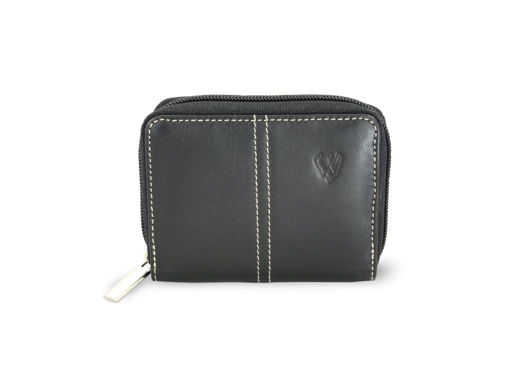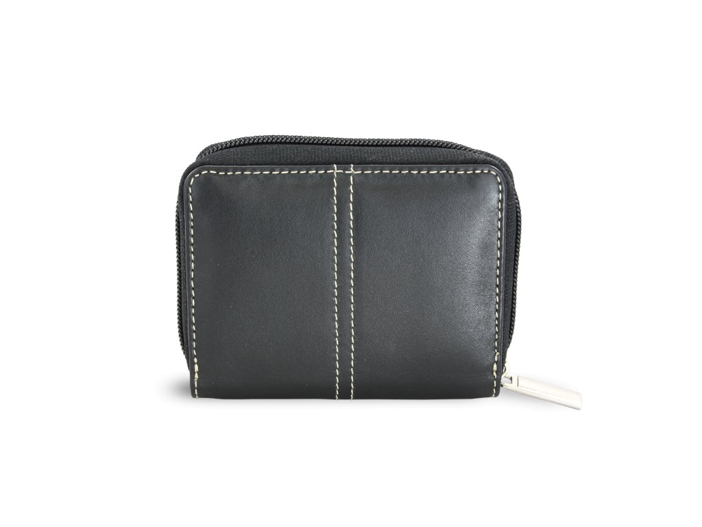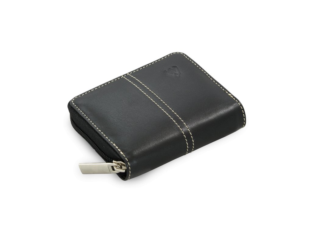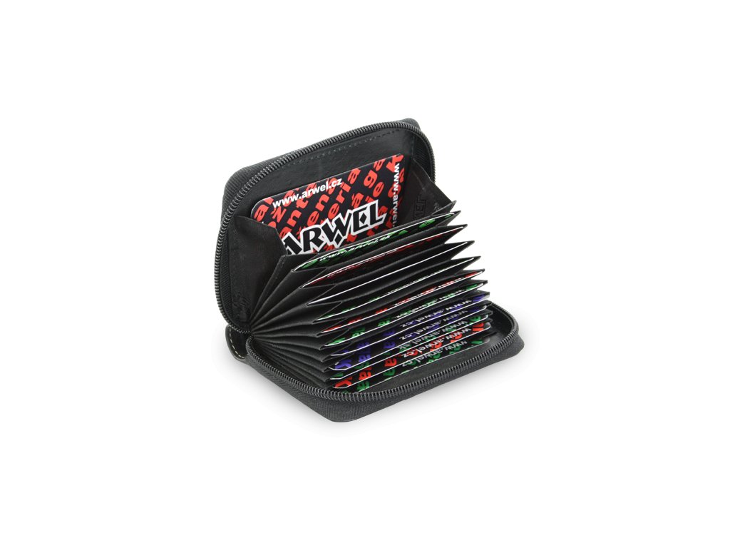 Čierny kožený zásobník so svetlo šedým prešívaním. Zásobník je na 10 kreditných kariet a ďalšie dve veľké vrecká na kreditné karty alebo vizitky.
