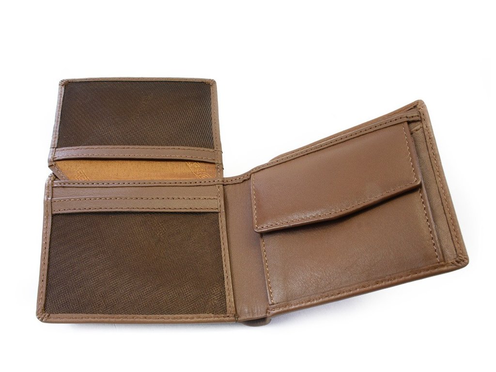 2 priehradky na zložené bankovky (pozdĺžne), vrecko na mince, 4 vrecká na kreditné karty, 1 vnútorné a 1 priehľadné vrecko.
