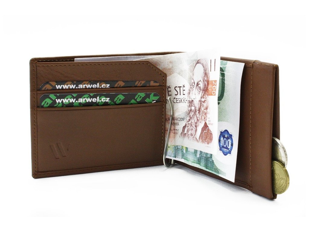 Pružina na uchytenie bankoviek, 2 vrecká na kreditné karty, 1 vnútorné vrecko a pružinové vrecko na mince.