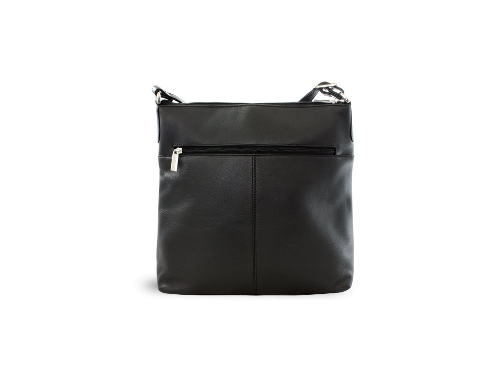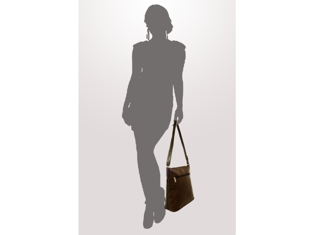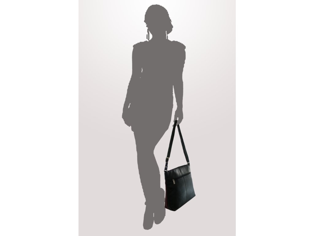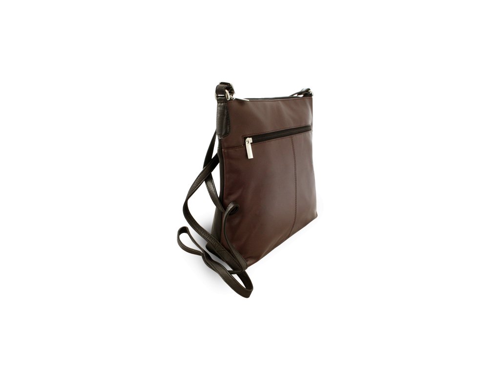 Obojstranná kabelka - predná strana tmavo hnedá, zadná strana čierna farba. 1 hlavné zipsové vrecko, 1 vnútorné zipsové a 1 otvorené vrecko, 2 vonkajšie zipsové vrecká, zrkadlo v koženom púzdre, nastaviteľný kožený popruh v max. dĺžke 145 cm.