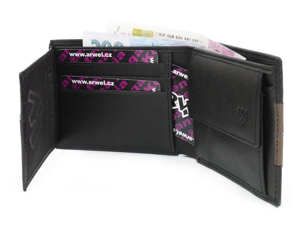 2 priehradky na bankovky, klopnové vrecko na mince, 6 vreciek na platobné karty či doklady, 1 priehľadné okno, 1 skryté vrecko.