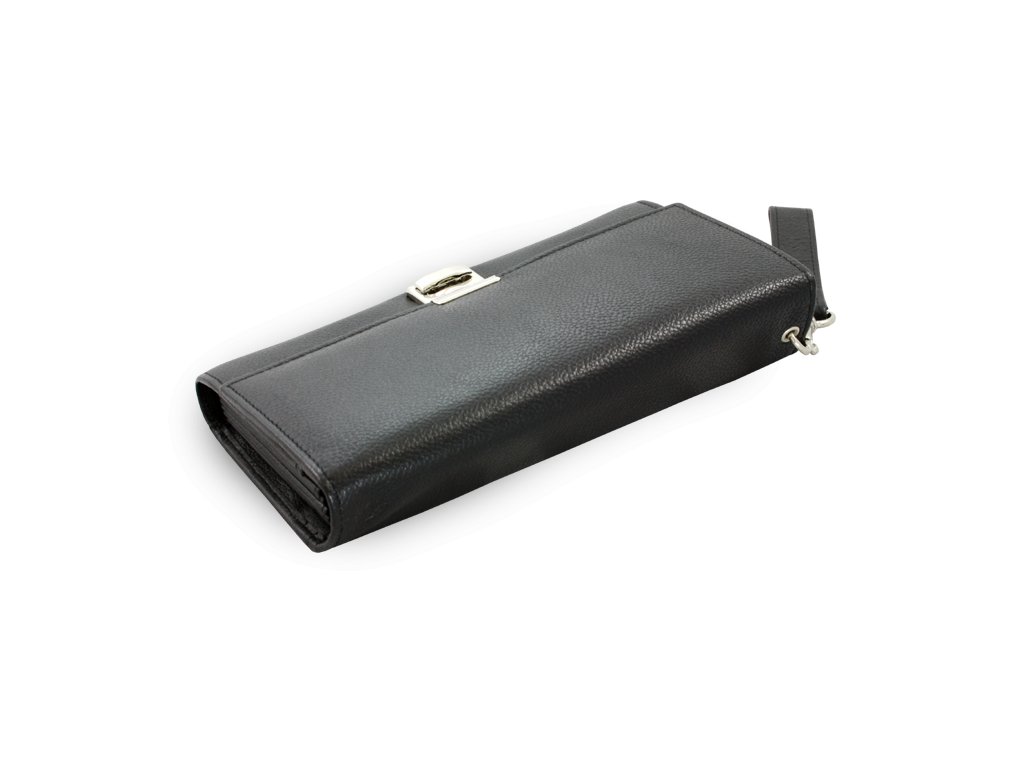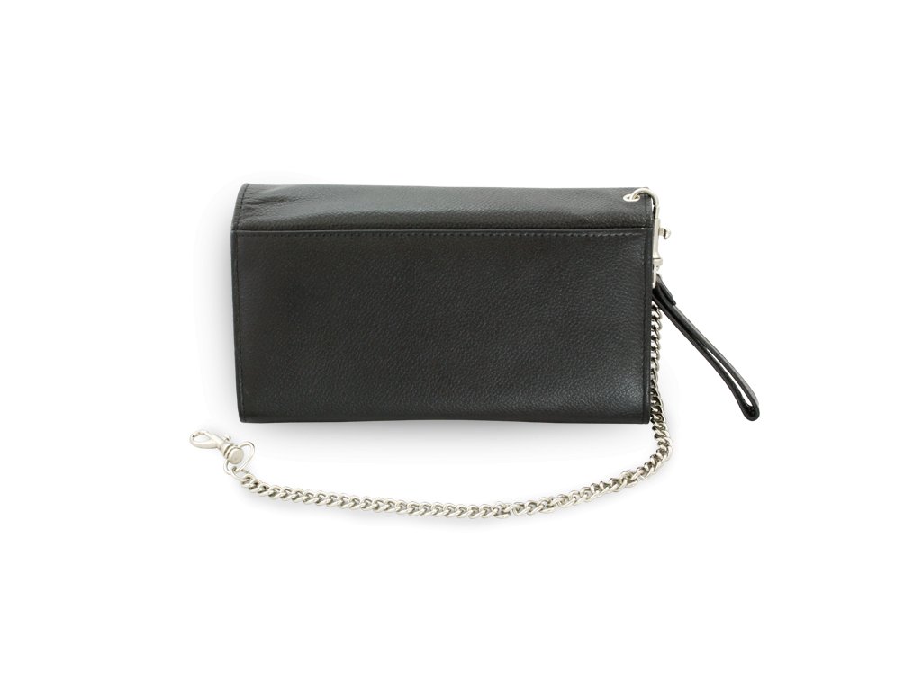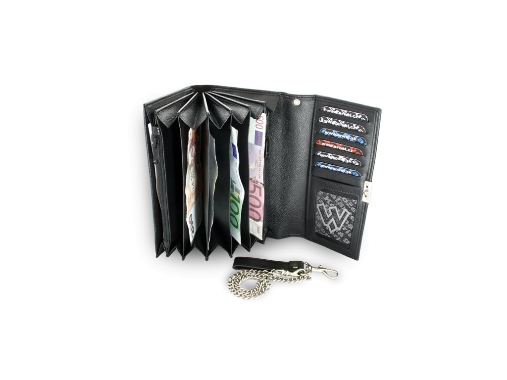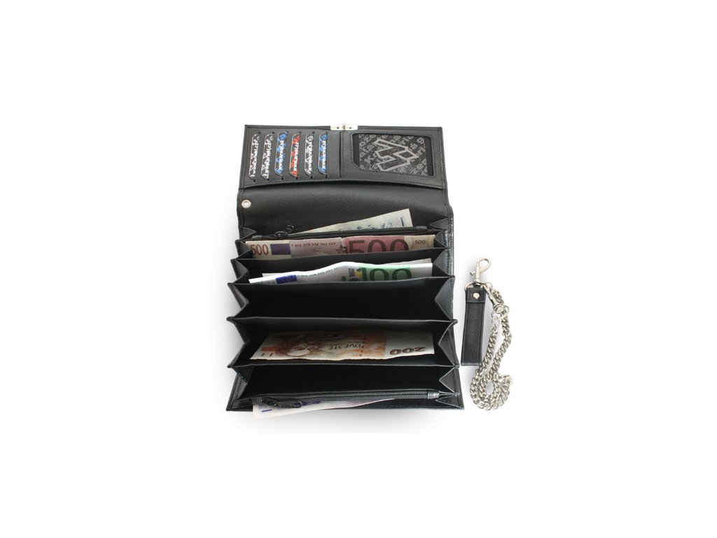 Peňaženka (flek) s retiazkou a možnosťou pripnutia k opasku, uzáver na 3 pozície podľa naplnenia, 7 priehradok na bankovky, 2 zipsové vrecká na mince, 1 priehľadné vrecko.