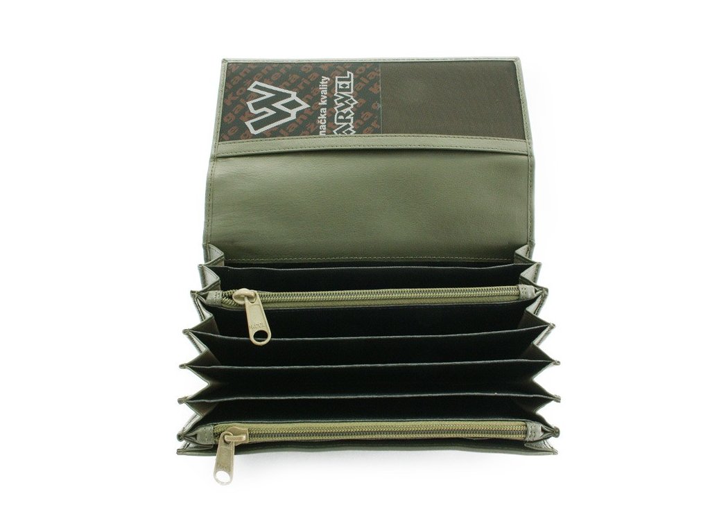 7 priehradok na bankovky, 2 zipsové vrecká na mince, 1 priehľadné vrecko, vrecko na zadnej strane.