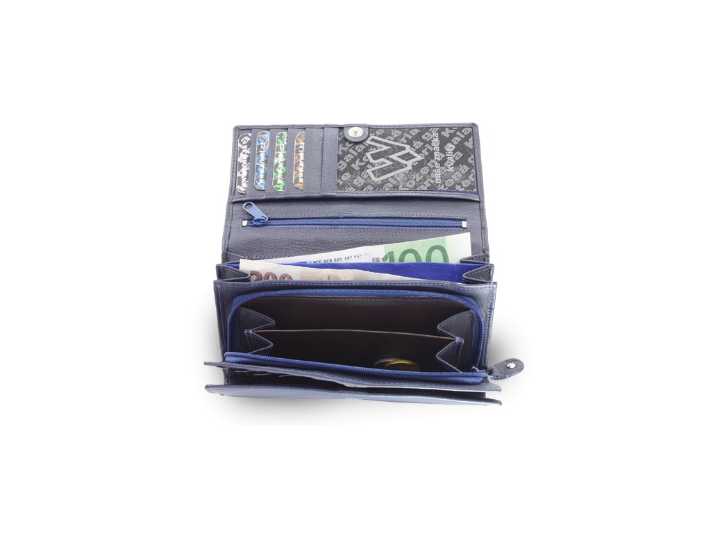2 priehradky na bankovky + 1 zdvojené zipsové vrecko na mince, 8 vreciek na kreditné karty, 3 priehľadné vrecká, 1 vnútorné a 1 zipsové vrecko, 1 zipsové a 1 otvorené zadné vrecko.