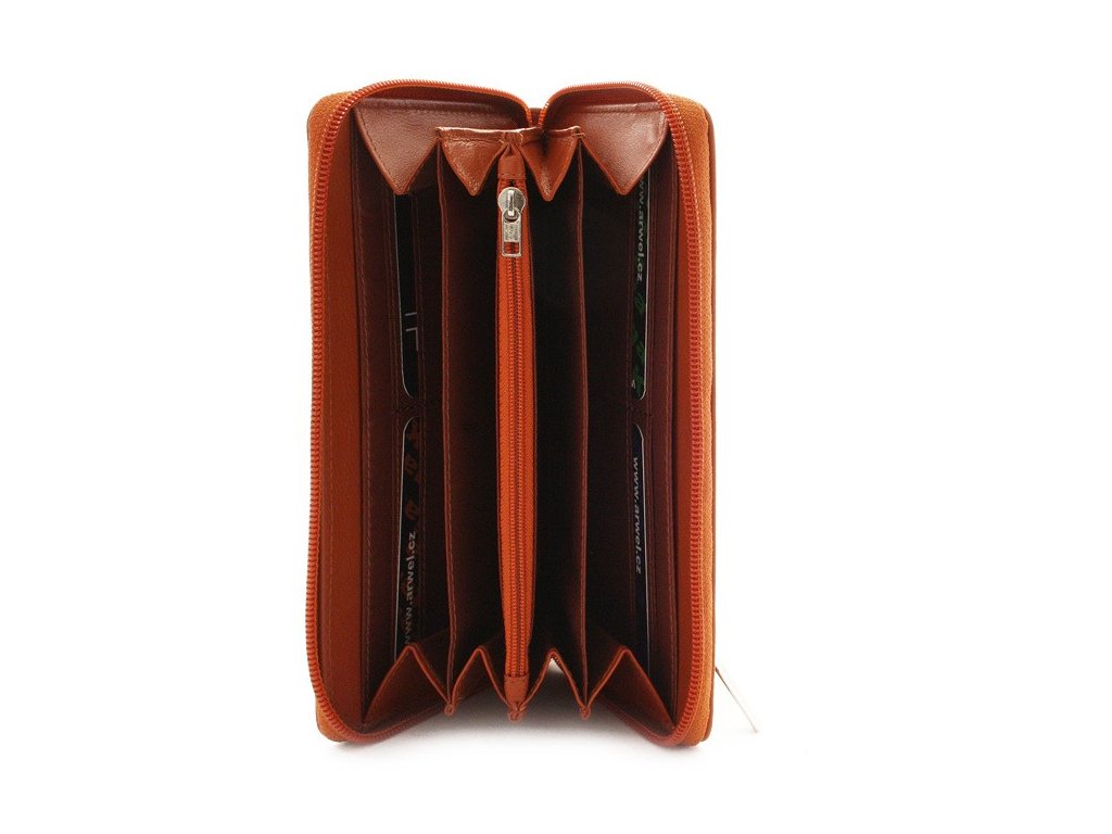 2 priehradky na bankovky a ďalšie 2 priehradky, do ktorých je možné vložiť mobilný telefón, vnútorné zipsové vrecko na mince, 10 vreciek na platobné karty či doklady, 1 zipsové vrecko na vonkajšej zadnej strane. Kovový zips.