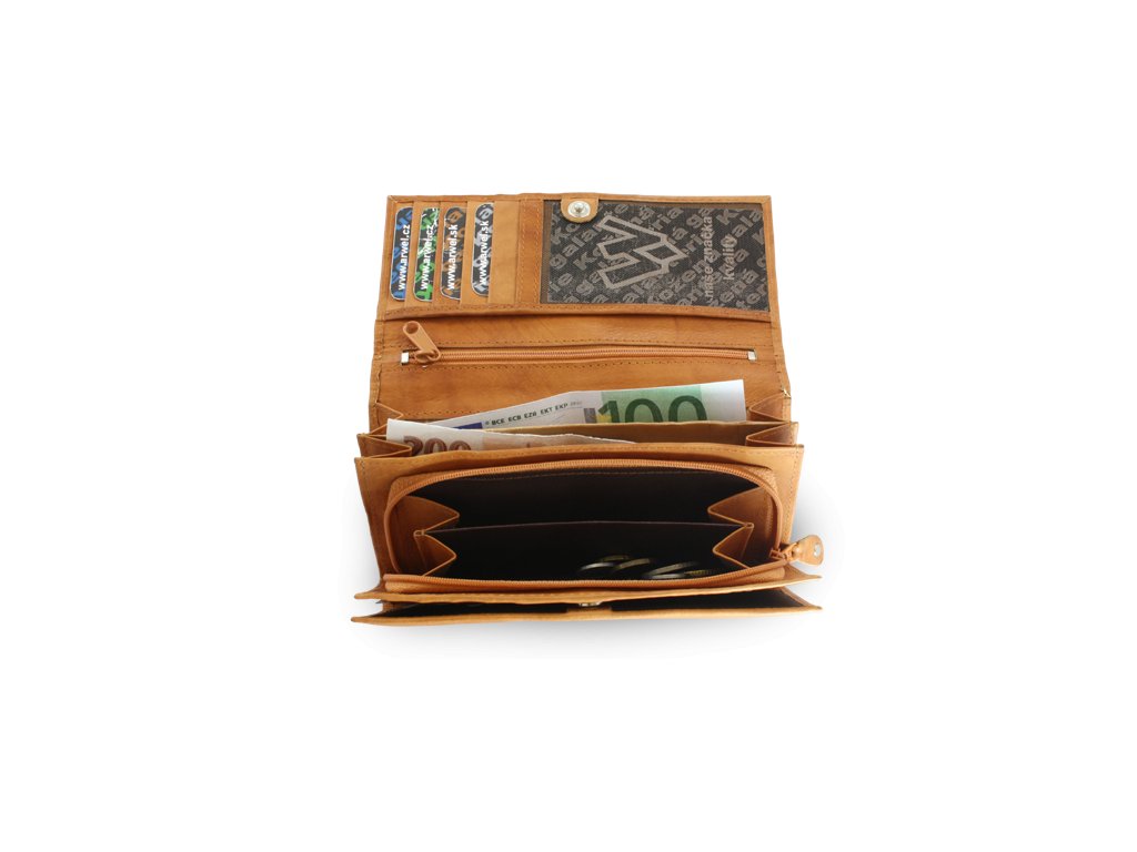 2 priehradky na bankovky + 1 zdvojené zipsové vrecko na mince, 8 vreciek na kreditné karty, 3 priehľadné vrecká, 1 vnútorné a 1 zipsové vrecko, 1 zipsové a 1 otvorené zadné vrecko.