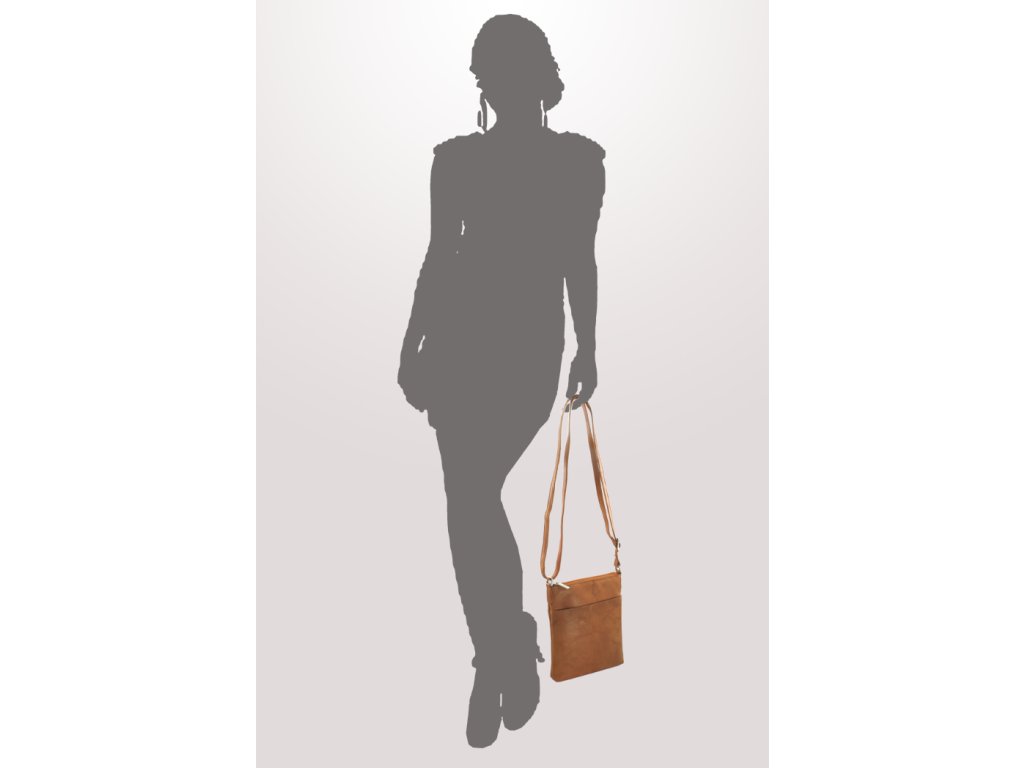 Vnútorné zipsové vrecko, odopínateľný krúžok na kľúče, zrkadlo v koženom púzdre, vonkajšie zipsové a otvorené vrecko, nastaviteľný kožený popruh v max. dĺžke 140 cm.