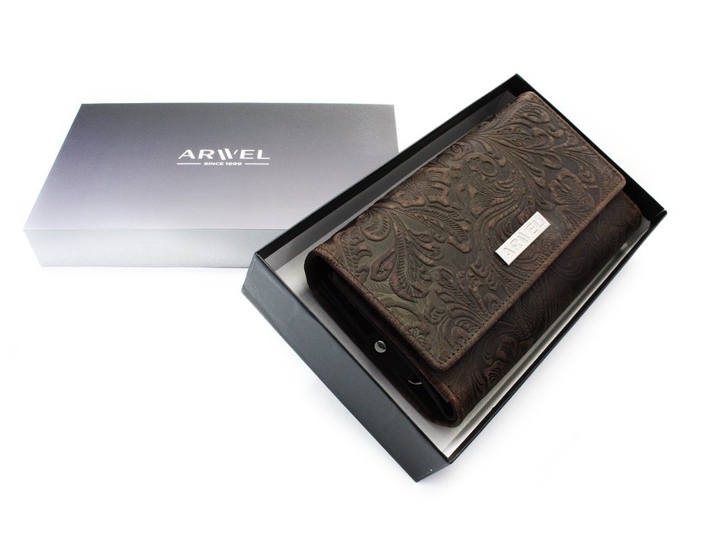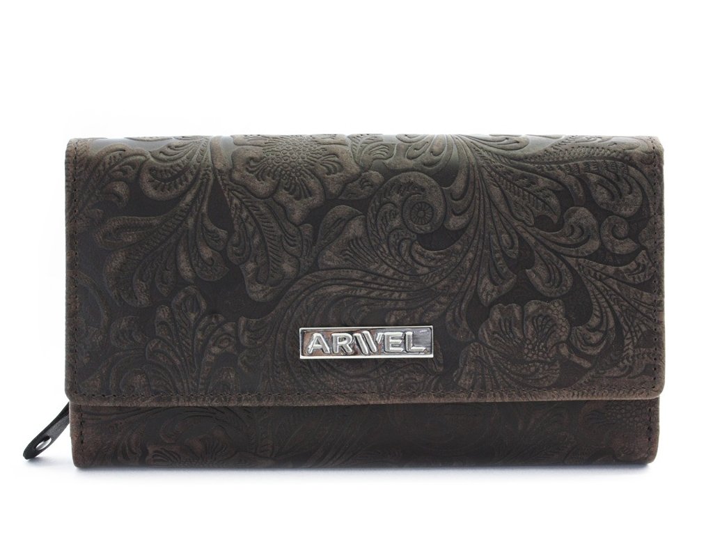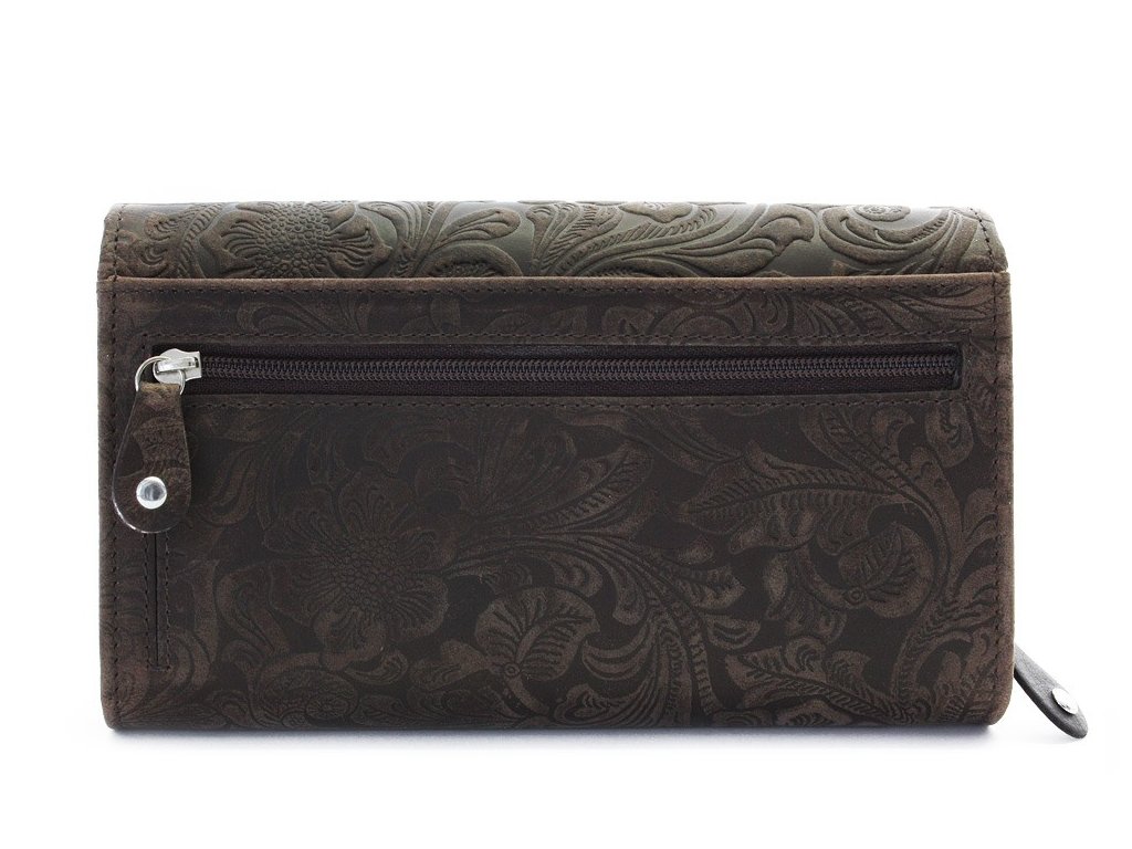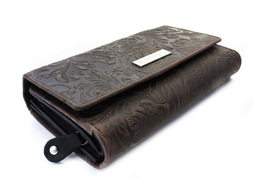 Tmavo hnedá dámska kožená klopnová peňaženka so vzorom 511-2235-47