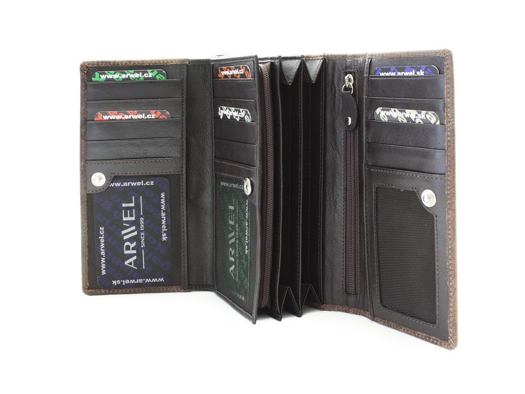 Atraktívna dámska veľká peňaženka obsahuje 2 priehradky na bankovky, vnútorné rozdelené zipsové vrecko na mince, 12 vreciek na platobné karty či doklady, 5 otvorených vreciek a 3 priehľadné okná. Na zadnej vonkajšej strane je zipsové vrecko. Peňaženka má zapínanie na poklop s ozdobným kovaním istenou cvokom. Šitie je vo farbe kože.