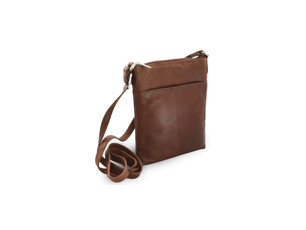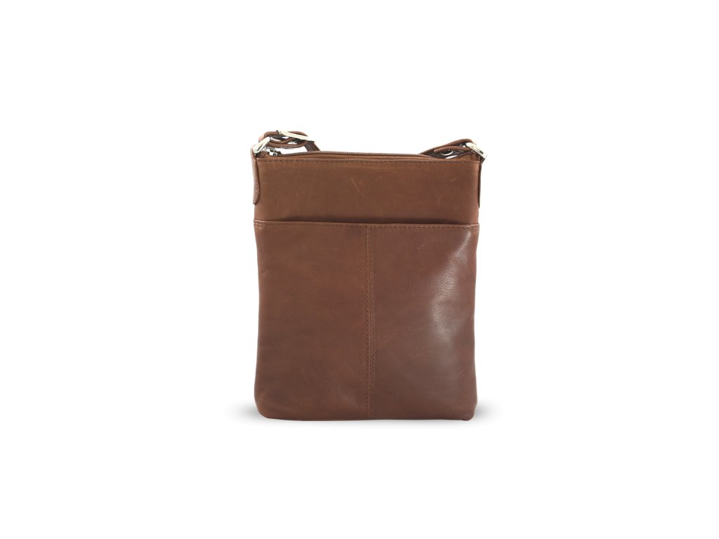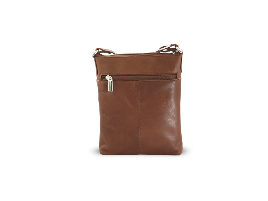 Vnútorné zipsové vrecko, odopínateľný krúžok na kľúče, zrkadlo v koženom púzdre, vonkajšie zipsové a otvorené vrecko, nastaviteľný kožený popruh v max. dĺžke 140 cm.