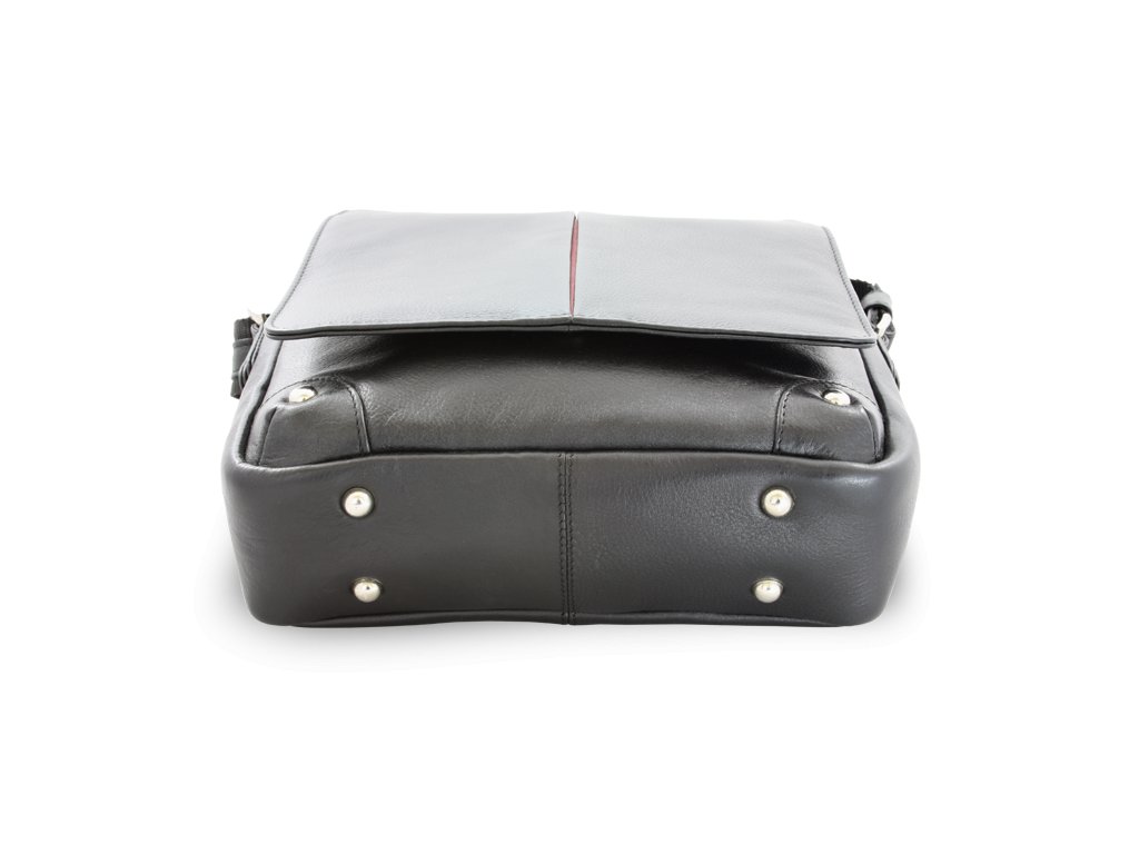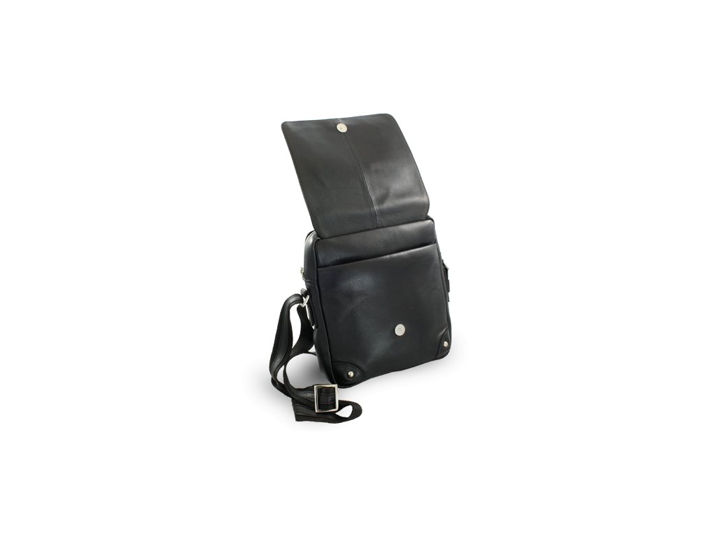 Zipsové vrecko pod poklopom s magnetickým uzáverom. Vrecko so zipsom po hornej strane obsahuje zipsové vrecko, väčšie vrecko a vrecko na mobil. Zadné vonkajšie zipsové vrecko. Pútko na prichytenie na opasok. Posilnenie rohov kovovými cvočkami. Nastaviteľný koženo-textilný popruh v max. dĺžke 140 cm.
