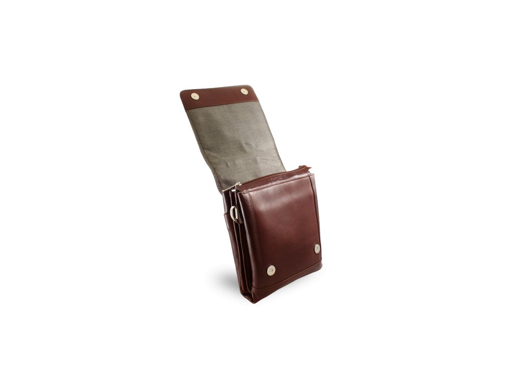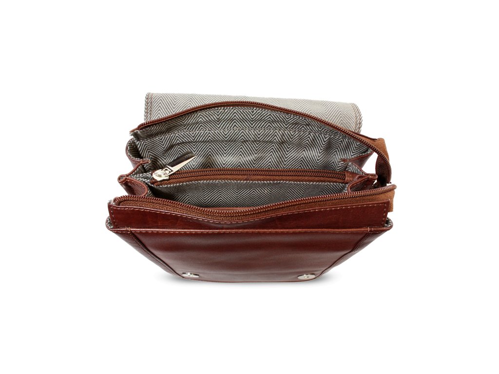 Pod poklopom je zipsový uzáver ukrývajúci 3 väčšie voľné vrecká, jedno väčšie vrecko zipsové a malé zipsové vrecko. Jedno z vreciek obsahuje vrecko na mobil a 2 očká na písacie potreby. Zadné vonkajšie vrecko s magnetickým uzáverom. Nastaviteľný kožený popruh v max. dĺžke 140 cm.